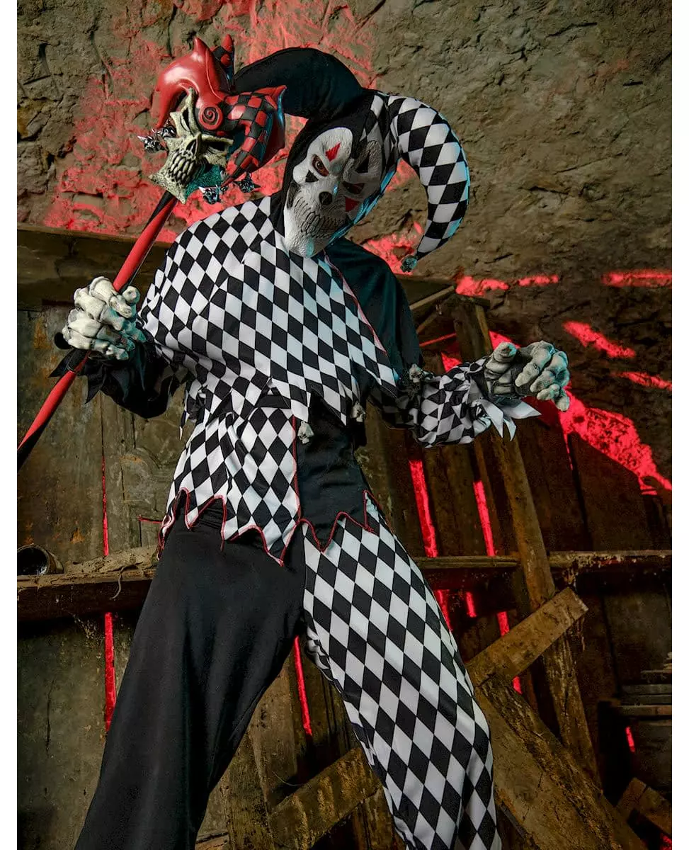 Demonisk klovn! Dette klovnekostymet for menn inkluderer en topp, bukser, et belte, et hodeplagg og en maske. Buksene til dette Harlekin-klovnekostymet er svarte på den ene siden og diamantmønstrede på den andre, akkurat som den frynsete toppen og hodeplagg. Hodeskallemasken er veldig skummel. Én ting er sikkert: denne klovnen har ingen sans for humor! Dette klovnekostymet for menn er ideelt for Halloween eller en temafest. Uten maske er det ideelt for et karneval. Inkludert tilbehør: topp, bukser, maske, hodeplagg, belte Materiale: 100 % polyester Vedlikehold: Håndvask