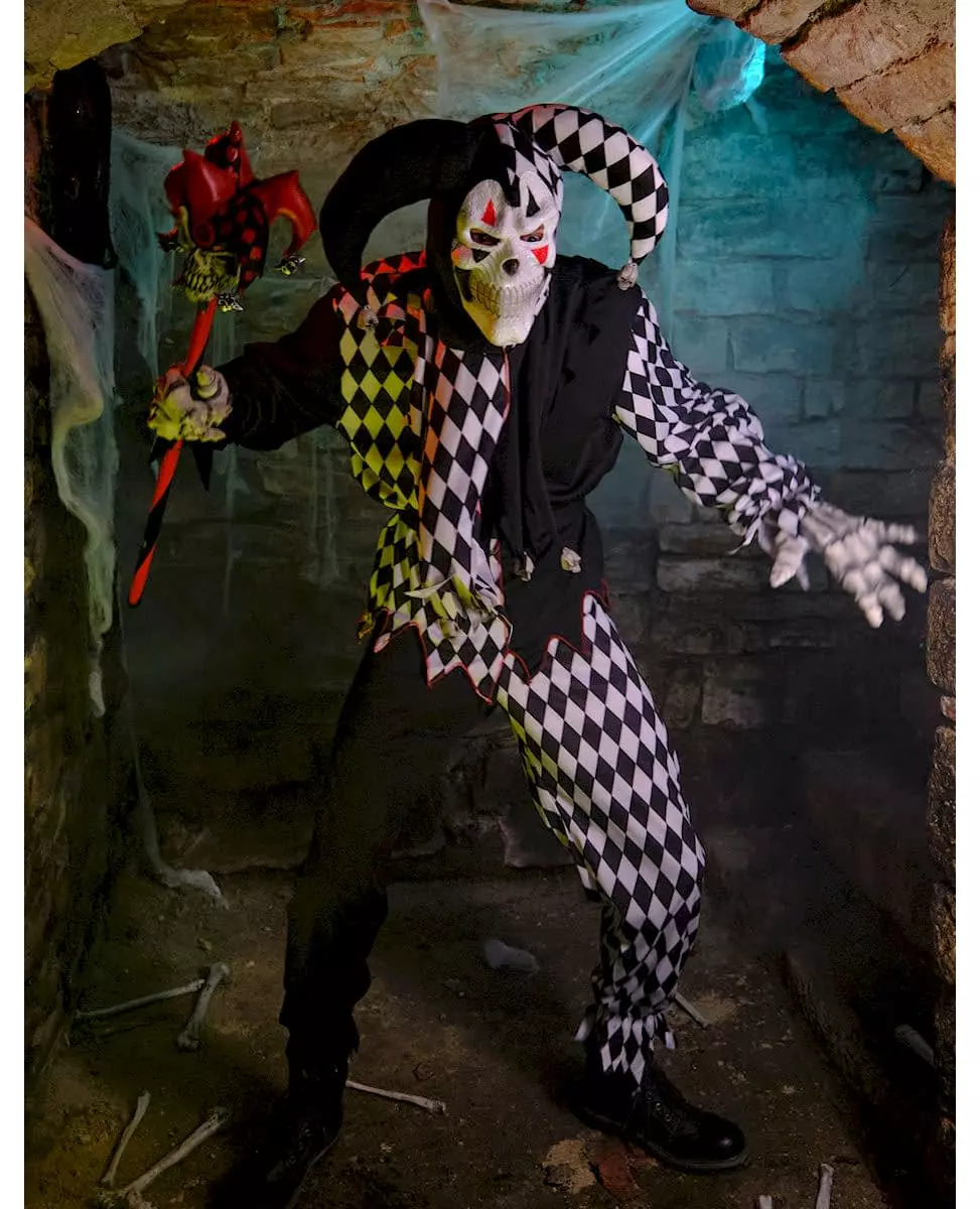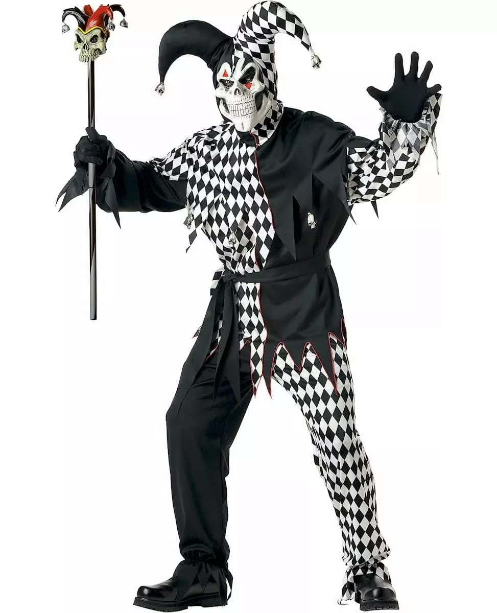 Demonisk klovn! Dette klovnekostymet for menn inkluderer en topp, bukser, et belte, et hodeplagg og en maske. Buksene til dette Harlekin-klovnekostymet er svarte på den ene siden og diamantmønstrede på den andre, akkurat som den frynsete toppen og hodeplagg. Hodeskallemasken er veldig skummel. Én ting er sikkert: denne klovnen har ingen sans for humor! Dette klovnekostymet for menn er ideelt for Halloween eller en temafest. Uten maske er det ideelt for et karneval. Inkludert tilbehør: topp, bukser, maske, hodeplagg, belte Materiale: 100 % polyester Vedlikehold: Håndvask