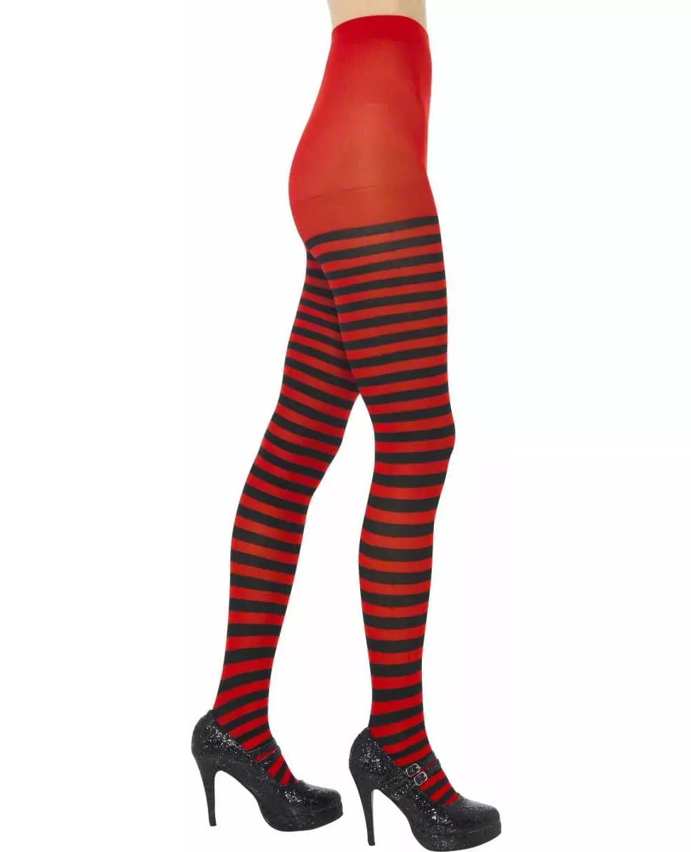 Rød og svart! Disse damestrømpebuksene har svarte og røde striper. De har elastikk i midjen for å tilpasse seg kroppsfasongen din perfekt. Dette tilbehøret vil være ideelt for å fullføre et kostyme til kostymefester. Materiale: 100 % nylon Vedlikehold: Håndvask
