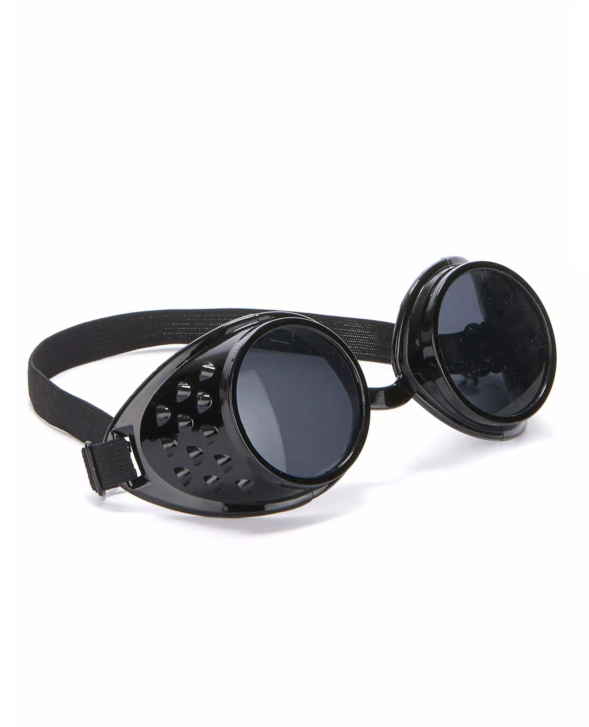 La oss legge ut på veien! Disse svarte bikerbrillene for voksne er laget av plast med tonede linser. Det er pigger på siden, og stroppen som går rundt hodet for støtte er elastisk. Disse brillene vil være et flott tilbehør for å fullføre et biker- eller steampunk-kostyme!. Inkludert tilbehør: Briller Materiale: Plast