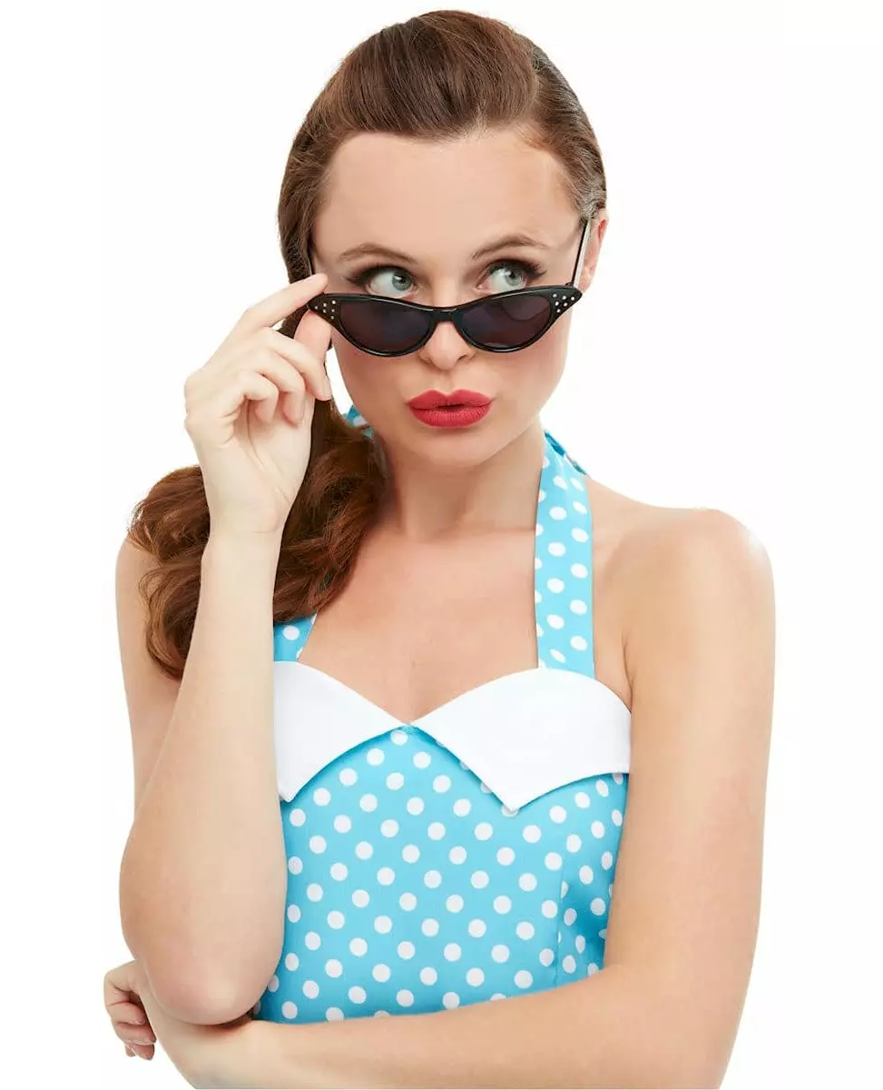 Retro Chic Disse retrobrillene for kvinner er formet som sommerfuglbriller som var moteriktige på 50-tallet. Disse brillene har en svart plastinnfatning med strass på hver side av sirklene. Linsene på disse brillene er også tonet for enda mer stil. Disse brillene vil være det ultimate tilbehøret til ditt 50-talls retrokvinnekostyme til et karneval, nyttår eller en retrotemafest. Inkludert tilbehør: Briller Materiale: 40 % akryl, 60 % polyamidplast