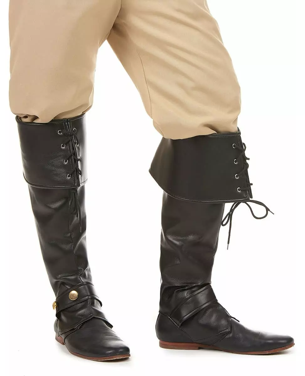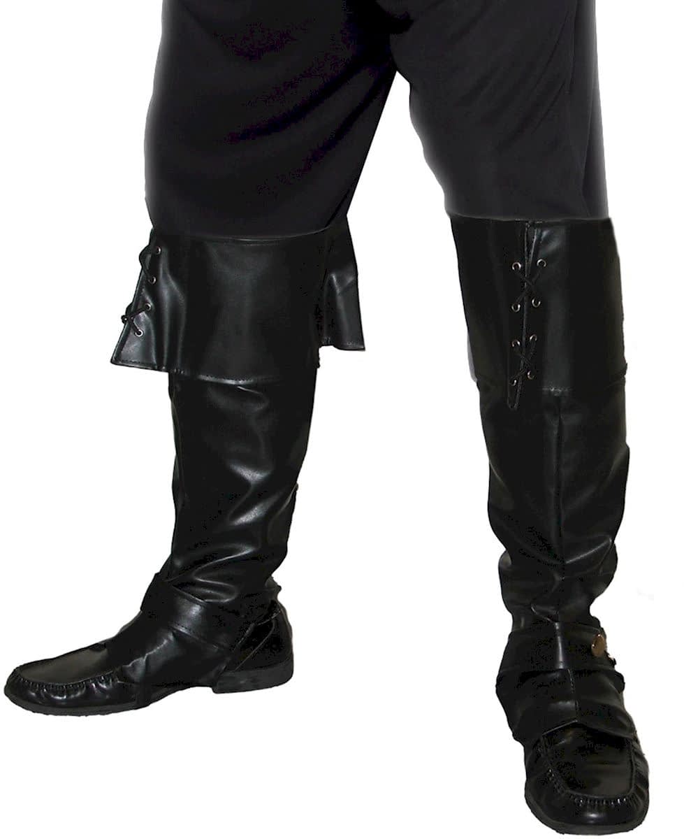 Med elastisk støtte! De svarte piratstøvlene er laget av imitert skinn. Overdelen har svarte lisser, og underdelen har en løkke med to gullknapper. To strikker er plassert under foten for å sikre god støtte (bukser og sko er ikke inkludert). Dette tilbehøret er perfekt for å fullføre et piratkostyme, til en kostymefest, et show eller til karneval. Inkludert tilbehør: Støvler