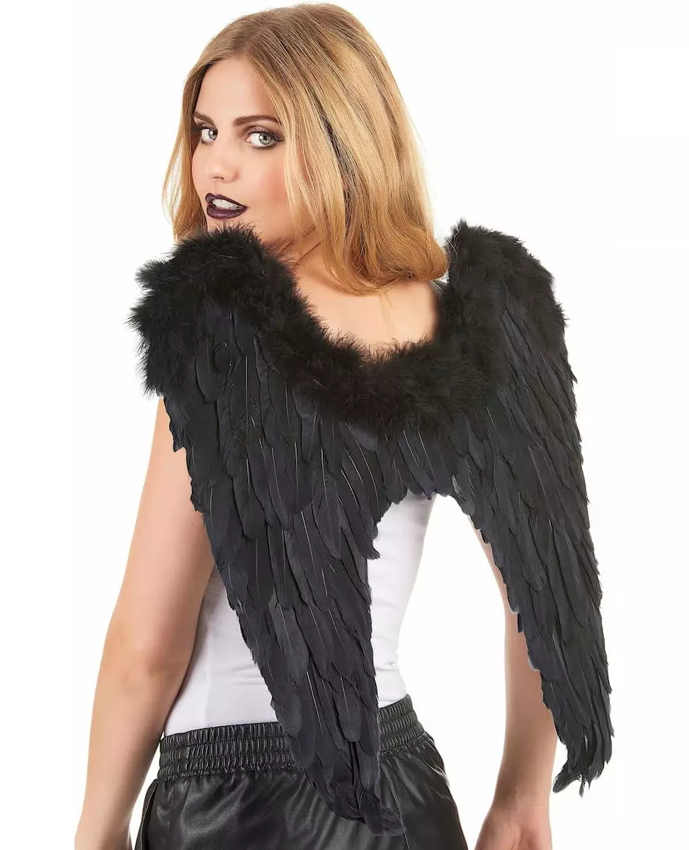 50 x 50 cm! Disse flotte svarte vingene er laget av skinnende syntetiske fjær. Vingene måler 50 cm høye og 50 cm i diameter. Vingene kan bæres som en ryggsekk takket være to store svarte strikker. Enten du leker svarte engler eller kler deg ut som en svart fugl, vil disse vingene være ideelle for å gjøre et sterkt inntrykk på karnevalet! Inkludert tilbehør: Par vinger Materiale: Syntetisk