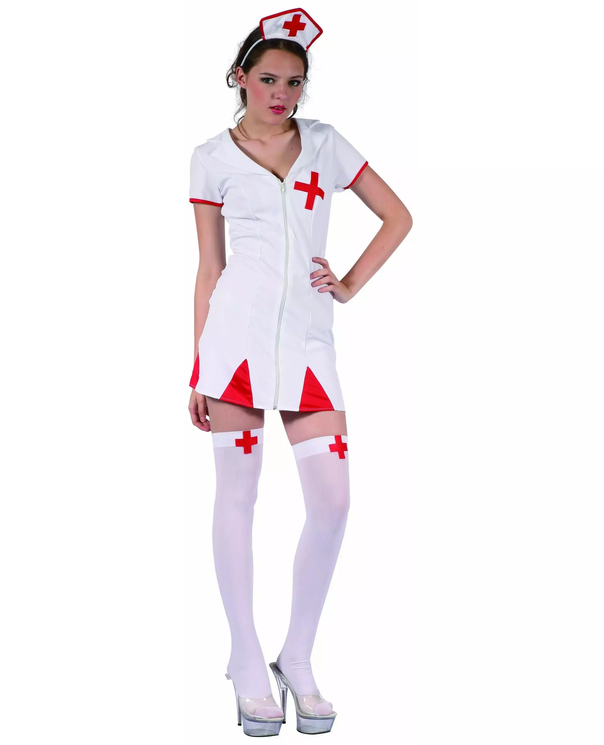 Ta vare på pasientene dine Dette sykepleierkostymet for kvinner består av en kjole og et hodeplagg (stetoskop, strømper og sko er ikke inkludert). Kjolen, som er veldig kort, er rød og hvit. Nederst på ermene er det en rød kant. Et rødt kors er også representert på brystet. Kjolen lukkes foran med glidelås. Sykepleierens hodeplagg (pannebånd) er hvitt og rødt. Det har et rødt kors på forsiden. Dette kostymet vil være perfekt for å spille den mest sexy sykepleieren til Valentinsdagen eller karnevalet. Inkludert tilbehør: Kjole Hodeplagg Materiale: 100 % polyester Stell: Håndvask