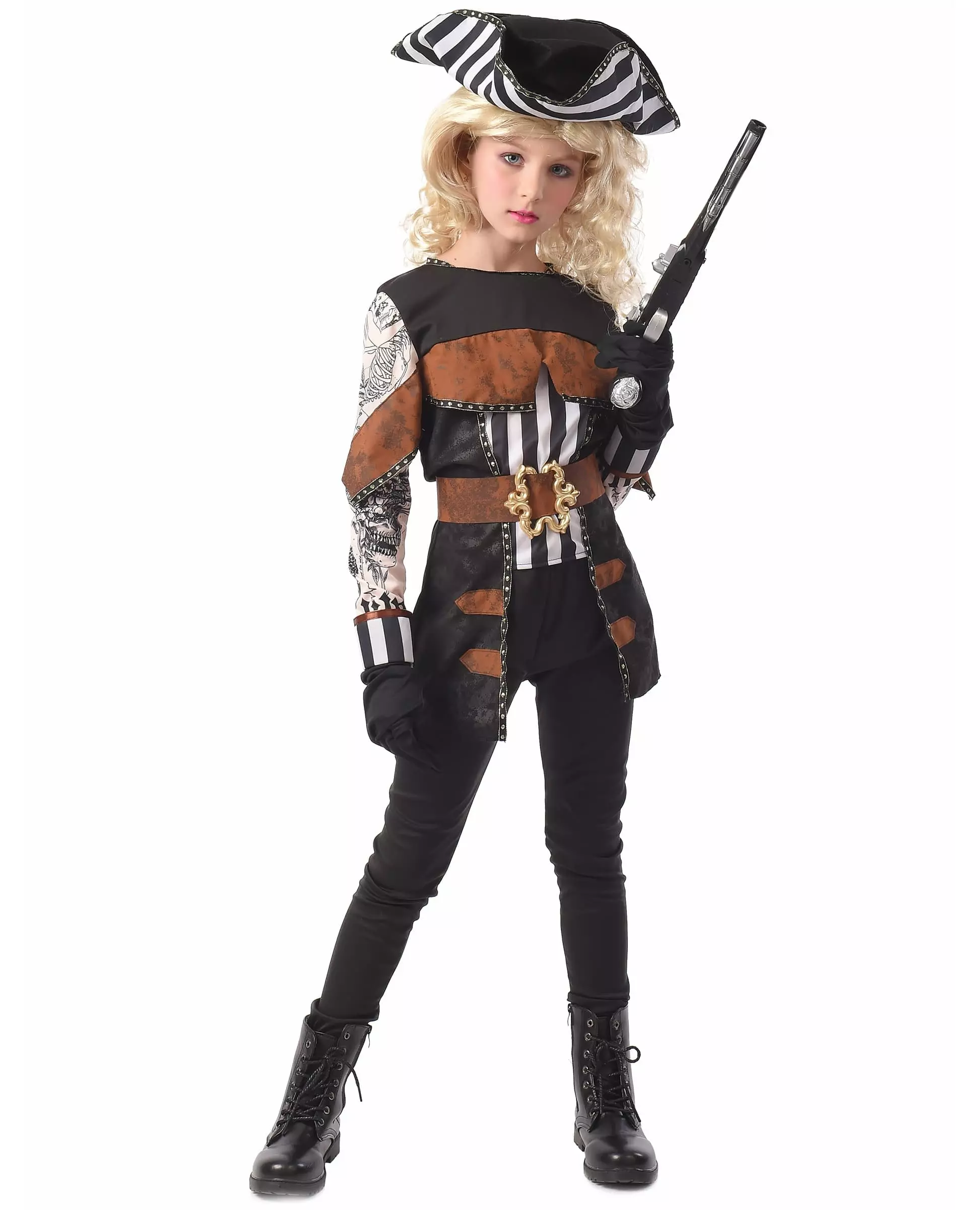 En ekte pirat til karnevalet! Dette tatoverte piratkostymet for jenter består av en topp, bukser, et belte og en hatt (sko, hansker, parykk og pistol er ikke inkludert). Toppen er svart og brun. Den er dekorert med svarte og hvite striper og har en falsk svart vest. Ermene er hvite med svarte mønstre som ser ut som falske tatoveringer. Beltet er brunt med en vakker gullbeltespenne. Den festes enkelt til livet. Hatten er en trefarget hatt. Den er svart på toppen og er dekorert med svarte og hvite striper. Kostymet inkluderer også svarte bukser. Dette tatoverte piratkostymet vil være perfekt for datteren din når hun skal på snowboard under karnevalet eller en pirattemafest!. Inkludert tilbehør: Topp, bukser, belte, hatt, pleie: Håndvask