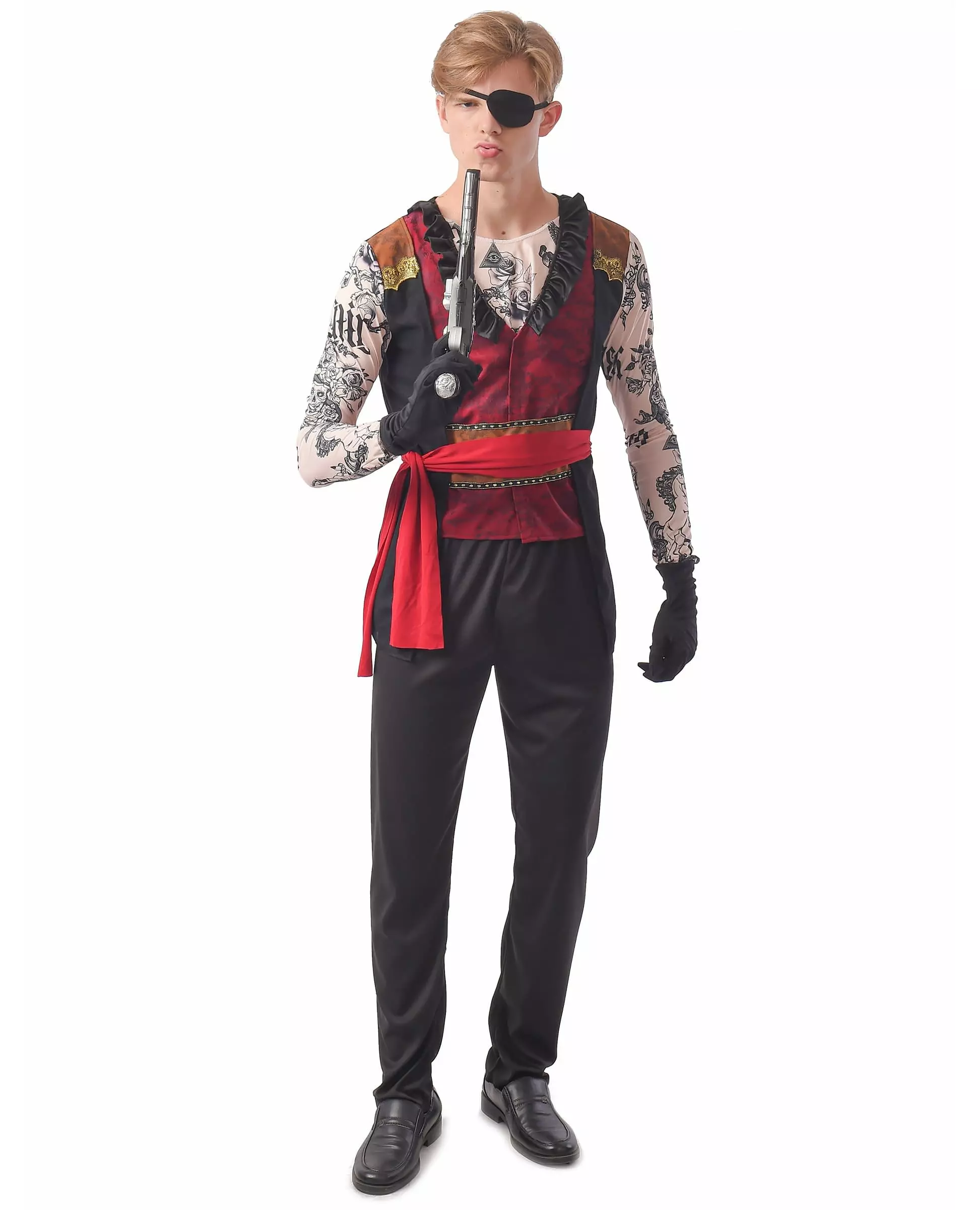 Alle om bord! Dette tatoverte piratkostymet for menn består av en topp, et belte og en øyelapp (bukser, sko og hansker er ikke inkludert). Toppen er rød og svart. Den er dekorert med gullmønstre, og skulderklaffene er brune. Kragen er V-formet og dekorert med svarte rysjer. Undertrøyen er sydd til T-skjorten og er gjennomsiktig hvit med svarte mønstre som representerer falske tatoveringer. Beltet er rødt og knytes rundt livet. Øyelappen festes enkelt til ansiktet med en strikk. Dette tatoverte piratkostymet vil være perfekt for å spille en ekte pirat på karneval eller en temafest! Tilbehør inkludert - Topp - Belte - Øyelapp