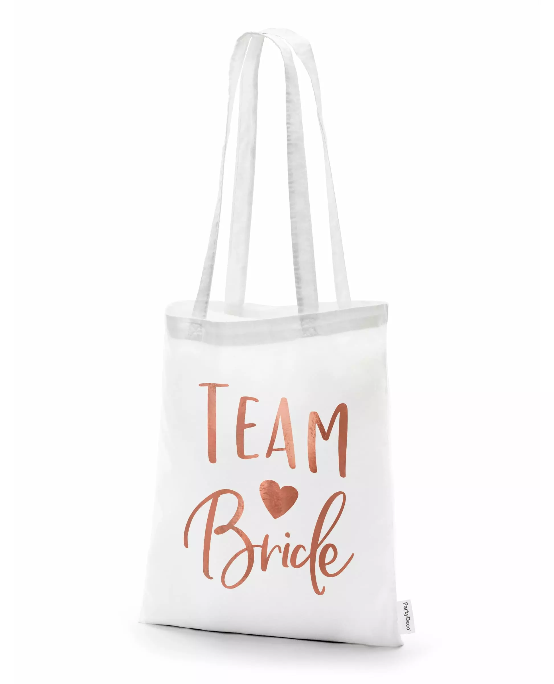 En fin handleveske som kan by på overraskelser til den vordende bruden! Denne handlevesken måler omtrent 42 x 39 cm. Laget av hvit bomull, har den påskriften «team bride» med rosegullbokstaver. Denne handlevesken vil være perfekt for et vanvittig utdrikningslag! Inkludert tilbehør: 1 handleveske Materiale: Bomull