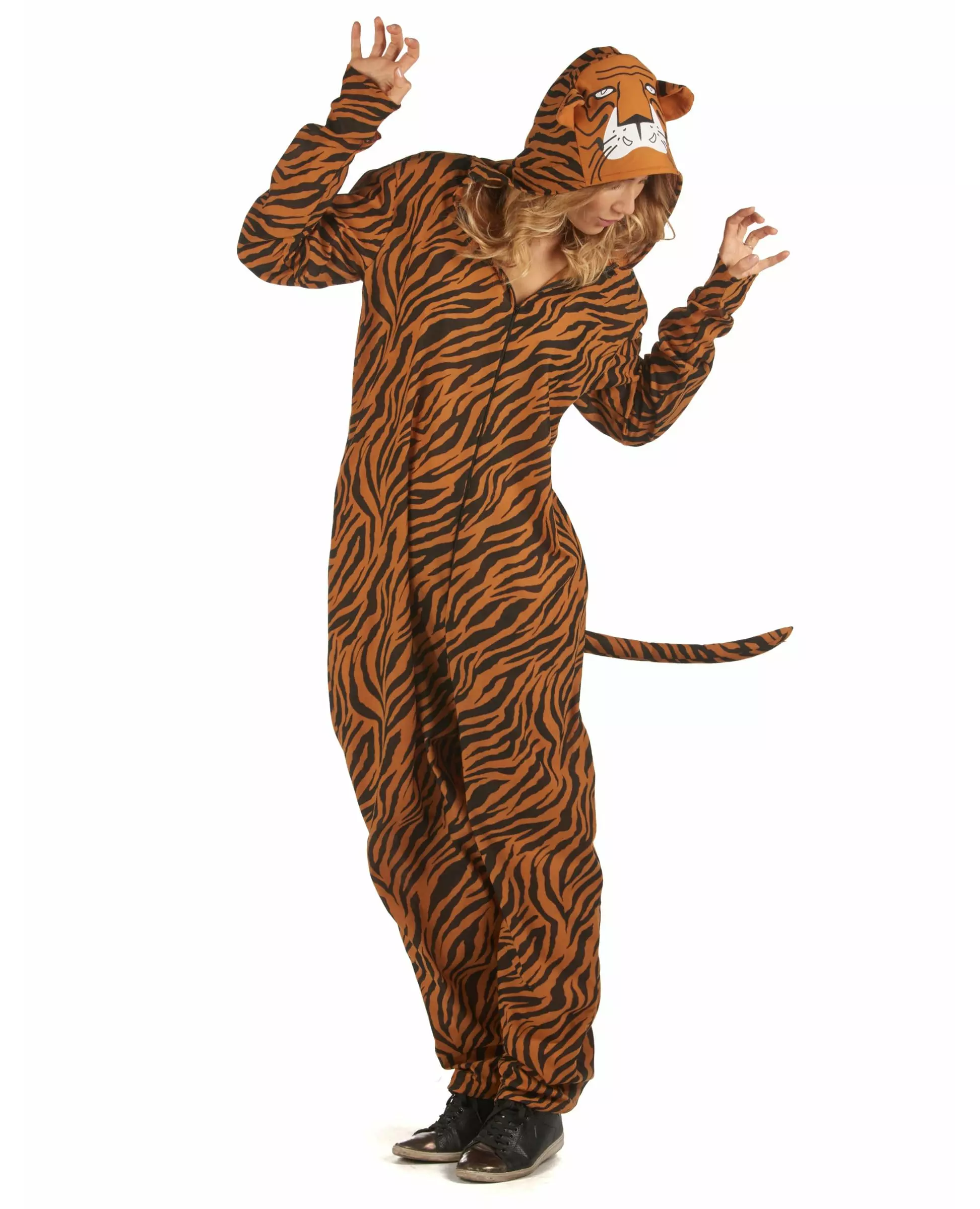 En original tiger! Dette tigerkostymet er for kvinner og består av en jumpsuit (sko ikke inkludert). Jumpsuiten er oransje og har svarte striper. Den har en hette som representerer tigerhodet. Den lukkes med glidelås. Velg dette tigerkostymet til karneval eller en fest med dyretema! Materiale: 100 % polyester. Inkludert tilbehør: Jumpsuit Stell: Håndvask.