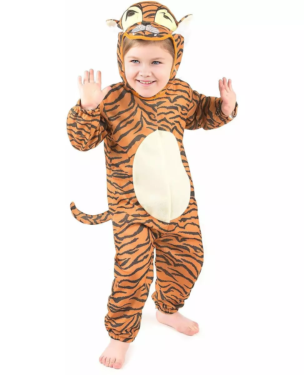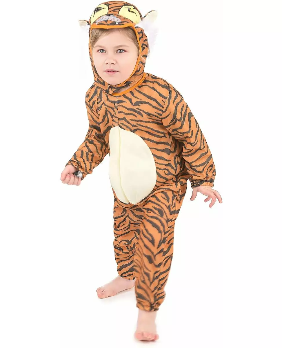 Hette med borrelås! Dette tigerkostymet for barn inkluderer en jumpsuit og en hette. Jumpsuiten har et tigertrykk med en beige mage. Den lukkes bak med borrelås. Armer og ben er elastikk for å skape en puffy effekt. Baksiden av jumpsuiten har en tigerhale som du kan ta av og på med borrelås etter ønske. Hetten festes under haken med borrelås. Toppen er laget av tykk filt, som sikrer at ørene holder seg på plass. Til et show eller karneval vil barnet ditt være dagens katt! Inkludert tilbehør: Jumpsuit Hette Hale Materiale: 100 % polyester Stell: Håndvaskbar Målinformasjon: For størrelse 3/4 år: Jumpsuit ca. 79 cm lang og 68 cm midjeomkrets.