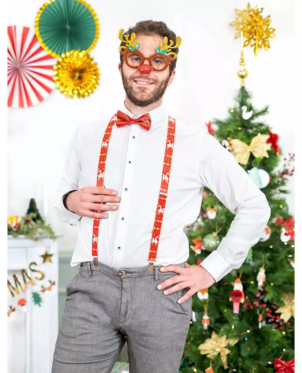 Her er en pakke som gir deg lyst til å feire jul! Dette julereinsdyrtilbehørssettet er for voksne. Dette settet inneholder: - et par briller - bukseseler - en sløyfe De er i julens farger rødt og hvitt. Små julepynter er trykt på de forskjellige gjenstandene (julerens, snøflak, girlandere, reinsdyrgevir). Fullfør antrekket ditt til julefesten med dette fantastiske settet! Inkludert tilbehør: Briller Bøyleseler Sløyfe Materiale: Plast Stell: Håndvask