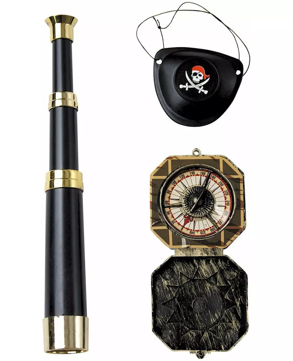 Sett seil! Dette piratsettet for voksne inkluderer en kikkert, en øyelapp og et kompass. Kikkerten er svart og gull. Den måler omtrent 21 cm lang. Den svarte øyelappen er dekorert med en hodeskalle og to kryssede piratsabler. Den holdes på plass med en strikk som går bak hodet. Kompasset måler omtrent 6 cm i diameter. Utsiden er børstet svart; innsiden er dekorert med en sol og gylne hender. Dette settet vil være perfekt for å fullføre et piratkostyme til en utkledningsfest eller et karneval! Inkludert tilbehør: Kikkert, øyelapp, kompass, materiale: plast,