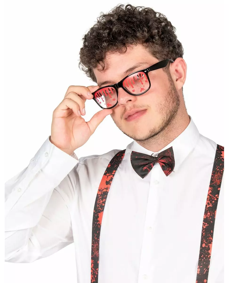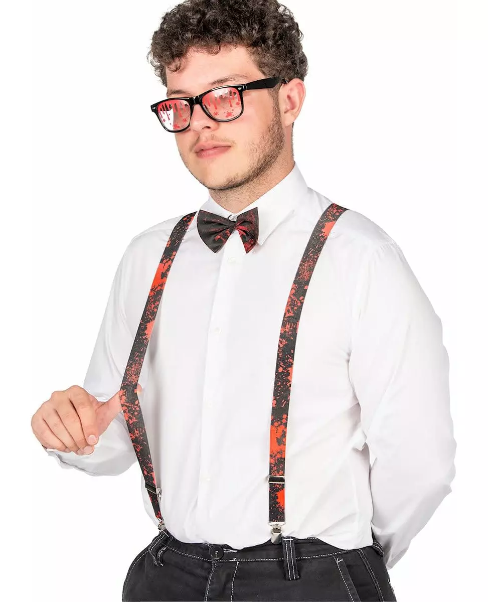 Et blodig sett til Halloween-festen din! Dette blodige, svarte tilbehørssettet er for voksne. Det inneholder 3 deler: - Et par blodige briller - En blodig sløyfe - Et par blodige bukseseler Fullfør Halloween-antrekket ditt med dette komplette og blodige settet! Inkludert tilbehør: 1 par bukseseler 1 sløyfe 1 par briller Materiale: Metall, polyester, plast Vedlikehold: Håndvask