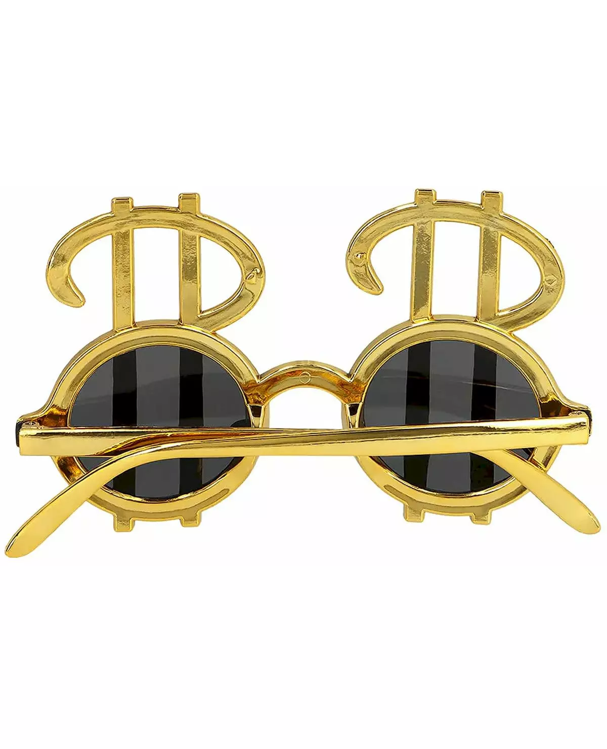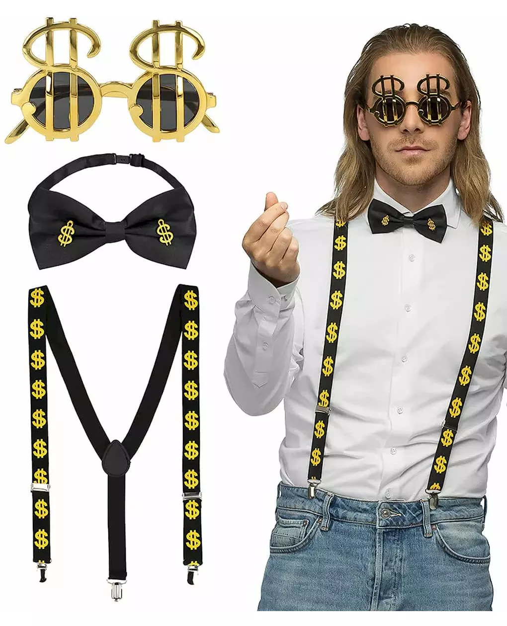 Et elegant og uvanlig antrekk for en uforglemmelig kveld! Dette dollartilbehørssettet for voksne inkluderer briller, sløyfe og bukseseler. Brillene har en gullinnfatning med "$"-symboler innlagt på hver linse, for et dristig luksuriøst utseende. Sløyfen, svart og elegant, er utsmykket med to "$"-symboler i midten, som diskret minner om din overdådighet. Til slutt fullfører et par svarte bukseseler antrekket, utsmykket med gullmønstrede "$" for en elegant og ekstravagant finish. Dette settet vil være perfekt for en kveld med tema eller til karneval. Inkludert tilbehør: Briller Sløyfe Bukseseler