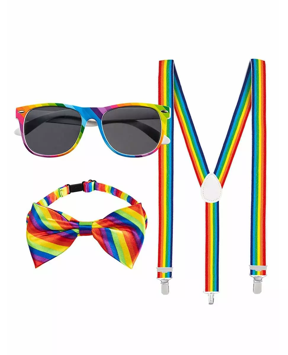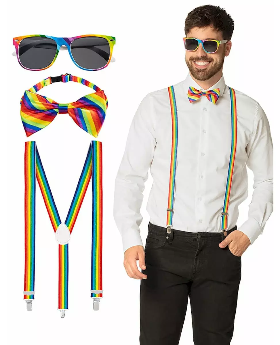 Et komplett sett! Dette regnbuefargede tilbehørssettet er for voksne. Det inneholder følgende: - et par bukseseler - et par briller - en sløyfe Fullfør antrekket ditt med dette regnbuefargede tilbehøret for å friske opp utkledningsarrangementet ditt, som for eksempel karneval eller festival! Inkludert tilbehør: Bukseseler, briller, sløyfe Materiale: Plast/polyester Vedlikehold: Kan ikke vaskes