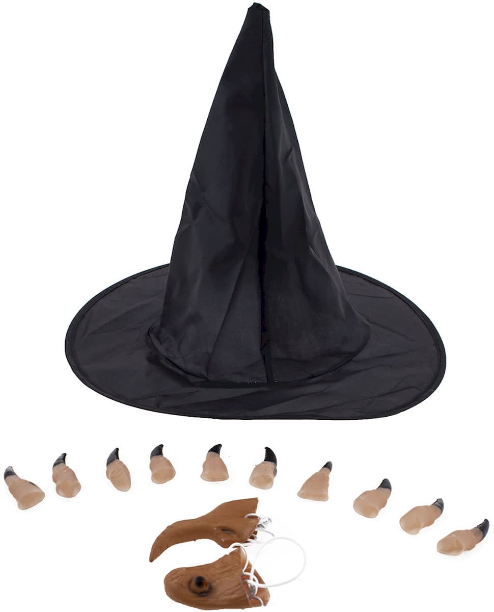 Et perfekt sett for en slem liten heks. Dette heksetilbehørssettet er for kvinner og inkluderer en spiss hatt, 2 neser og 10 fingre. Den spisse hatten er laget av svart stoff. Det er også 2 falske neser. Den ene er kroket og den andre har en vorte. De holdes på plass av en strikk som føres rundt ansiktet. 10 heksefingertupper med lange svarte negler fullfører dette settet. Dette settet vil være ideelt for et komplett heksekostyme på Halloween-kvelden. Inkludert tilbehør: 1 hatt 2 falske neser 10 fingre Materiale: 100 % polyesterstoff Stell: Håndvask