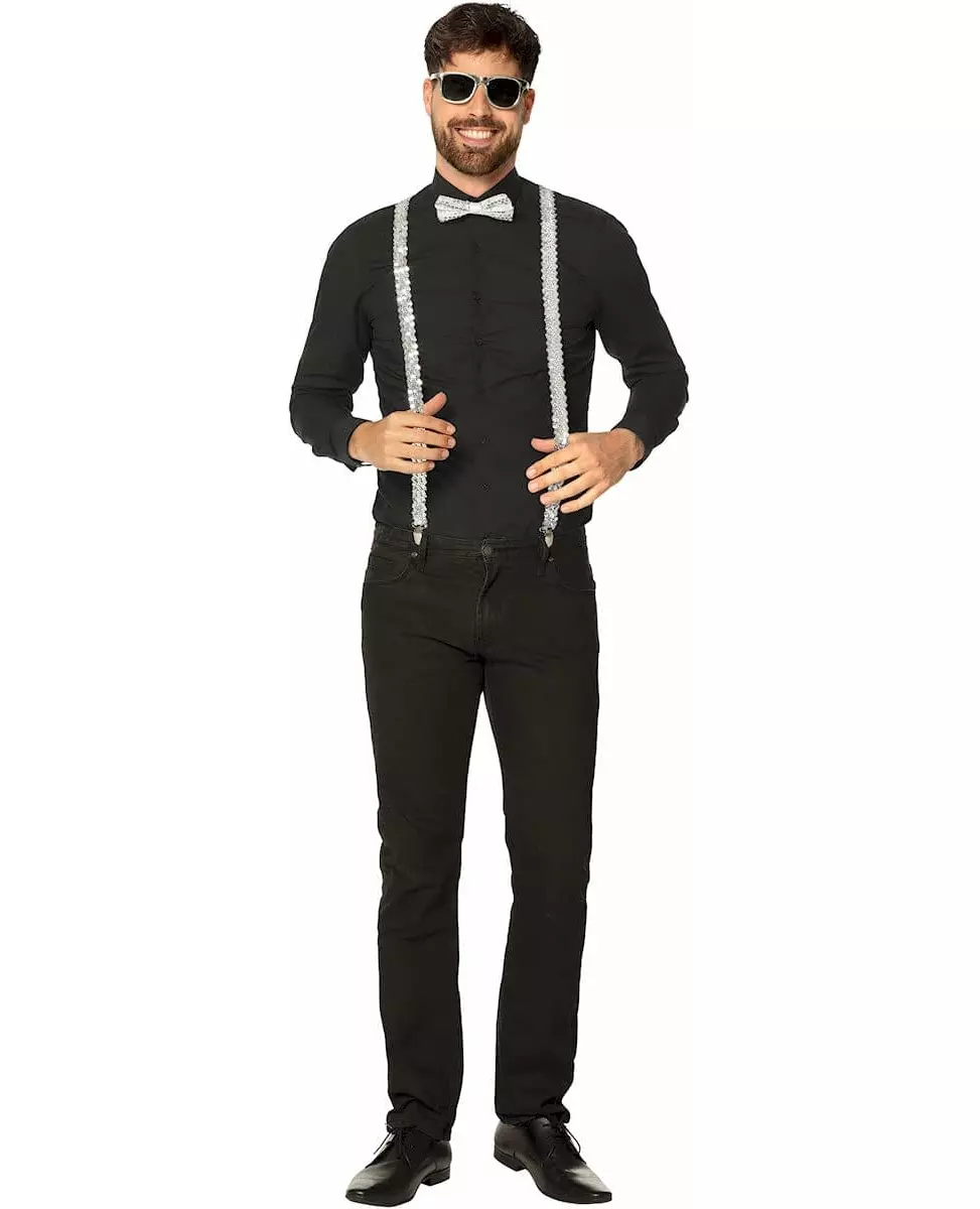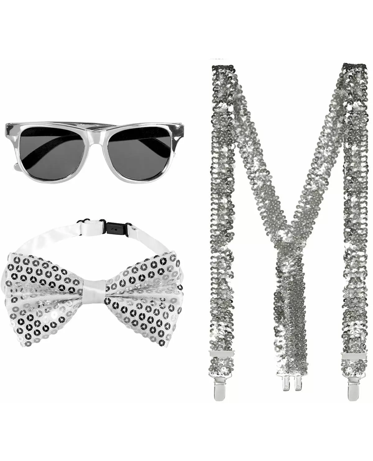 Sølvglitter for stilige og morsomme kvelder! Gi antrekket ditt et snev av glitter med dette sølvfargede paljetttilbehørssettet for voksne. Dette elegante settet inkluderer justerbare bukseseler, en elegant sløyfe og originale briller, alt utsmykket med glitrende paljetter som fanger lyset med hver bevegelse. De sølvfargede bukseselene gir et retro og trendy preg, mens sløyfen fullfører antrekket ditt med stil og raffinement. Brillene, med sine morsomme linser, gir et lekent preg til antrekket. Ideell for nyttårsaftenfester, kostymefester eller andre festlige arrangementer der du ønsker å skinne med eleganse!. Inkludert tilbehør: Bukseseler Briller Sløyfe