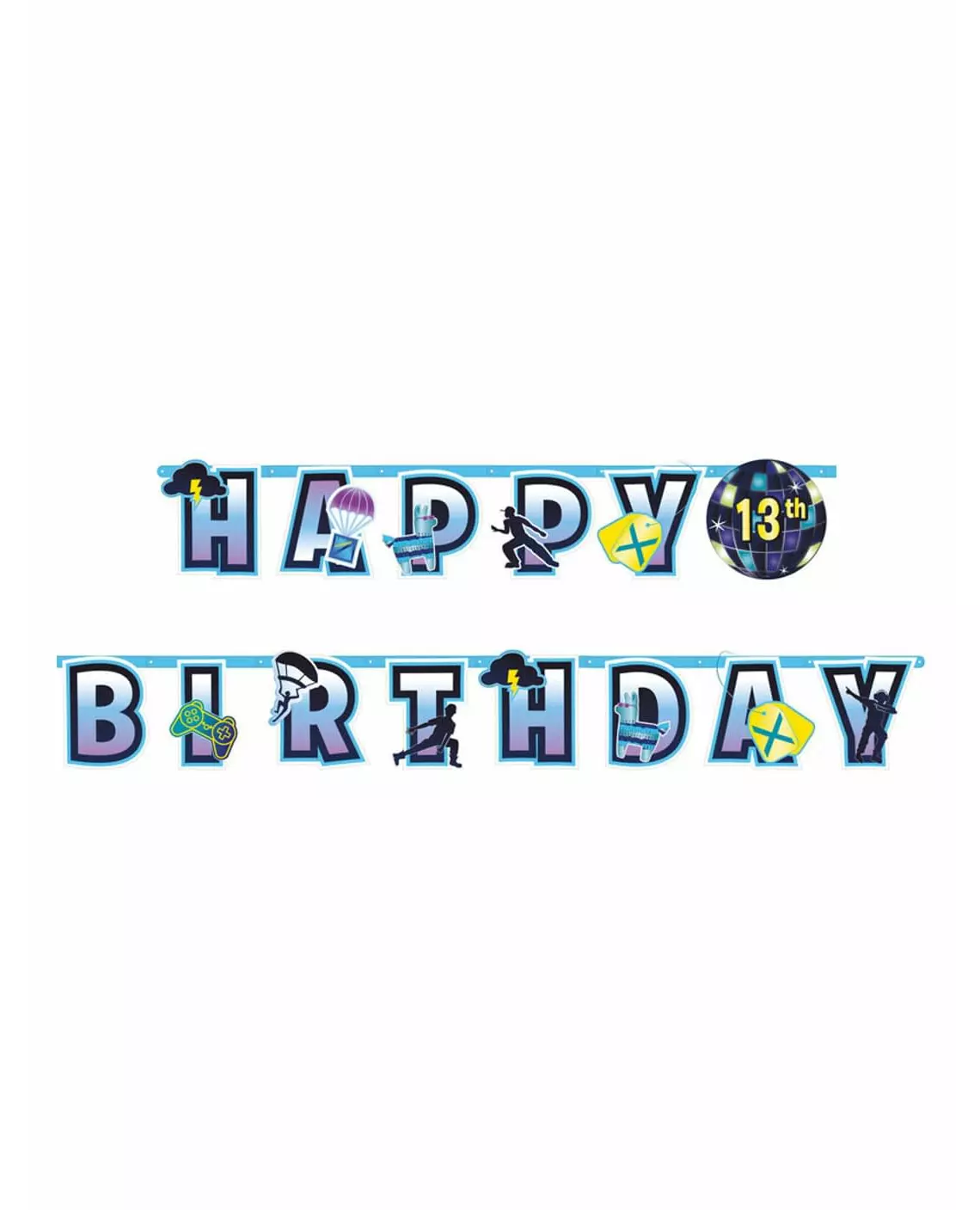 En bursdag i Battle Royale-atmosfære! Denne Battle Royale-girlanderen kan tilpasses. Den måler omtrent 320 x 26 cm og representerer ordene «Gratulerer med dagen», dekorert med elementer fra et Battle Royale-videospill. Discokulen i midten kan tilpasses med tall og bokstaver som kan festes med dobbeltsidig lim. Fullfør din Battle Royale-tema-dekorasjon til en bursdag med denne girlanderen! Inkludert tilbehør: 1 girlander 2 x 10 tall fra 0 til 9 4 bokstaver ST, ND, RD, TH 5 biter med dobbeltsidig lim Materiale: Papp