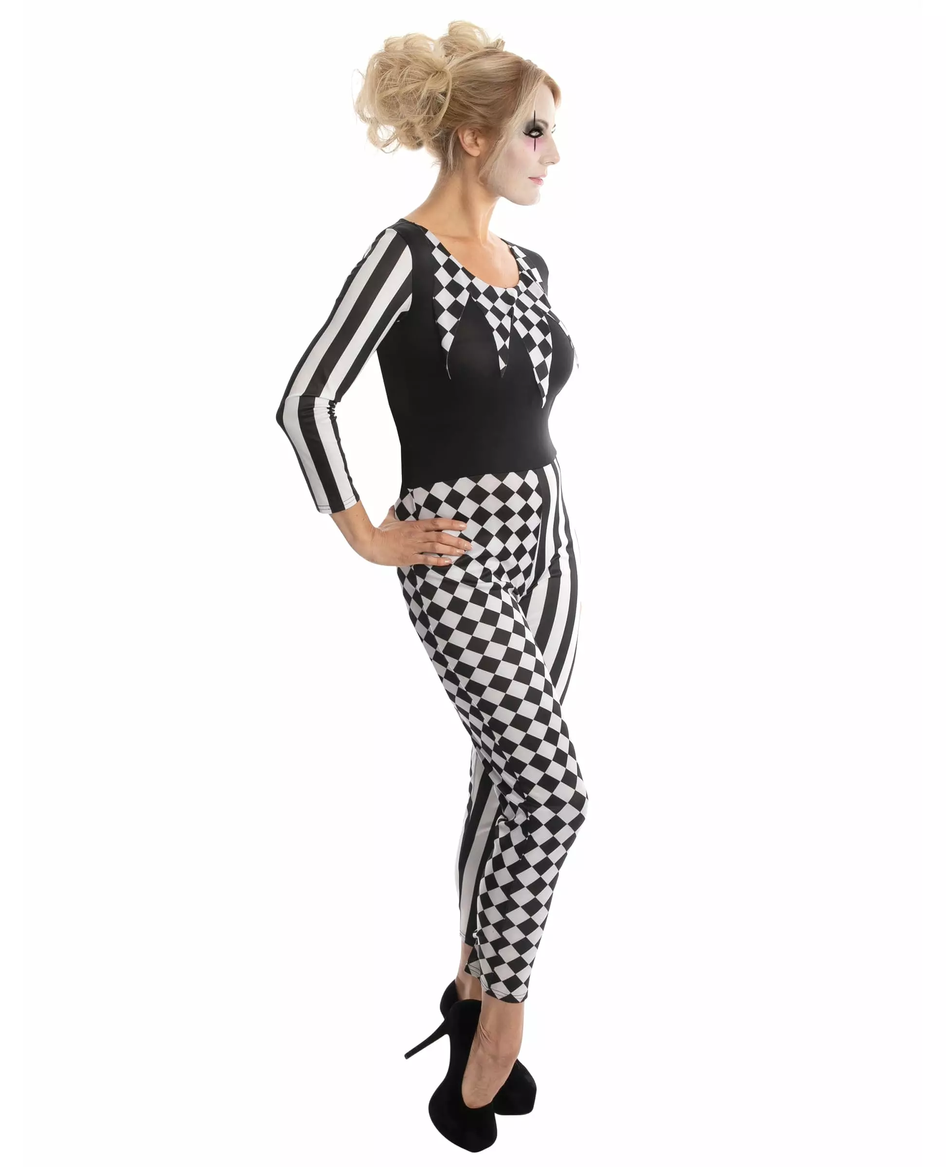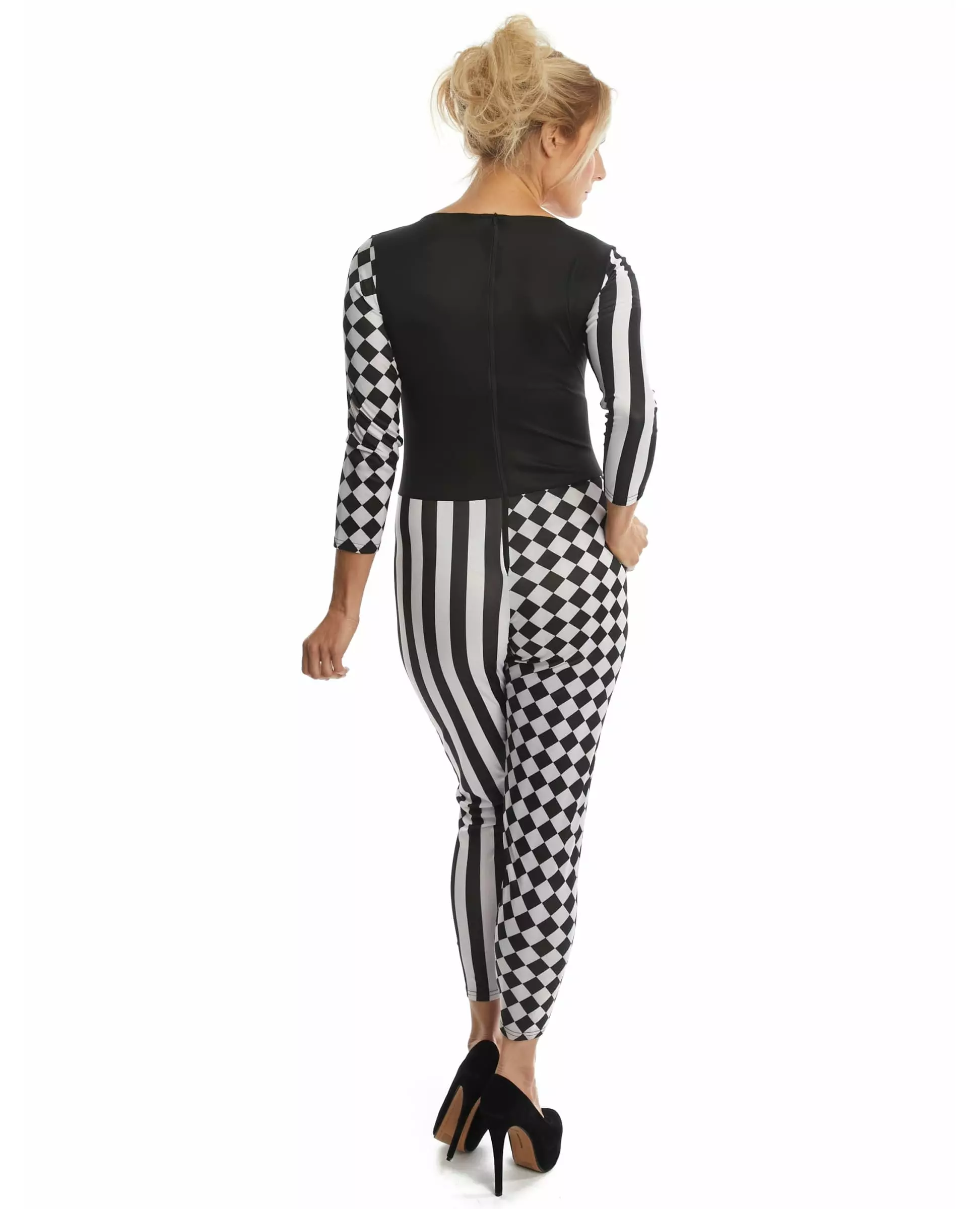 En tofarget klovn! Dette tofargede harlekinkostymet for kvinner inkluderer en jumpsuit. Jumpsuiten med lange ermer er svart og hvit. Toppen er svart ved bysten med en svart og hvit diamantmønstret krage. Det ene ermet har svarte og hvite vertikale striper, som det motsatte benet. Det andre ermet matcher kragen og det motsatte benet. Dette harlekinkostymet for kvinner vil være perfekt til Halloween, karneval eller en sirkusfest. Materiale: 100 % polyester. Inkludert tilbehør: Jumpsuit. Stell: Håndvask.