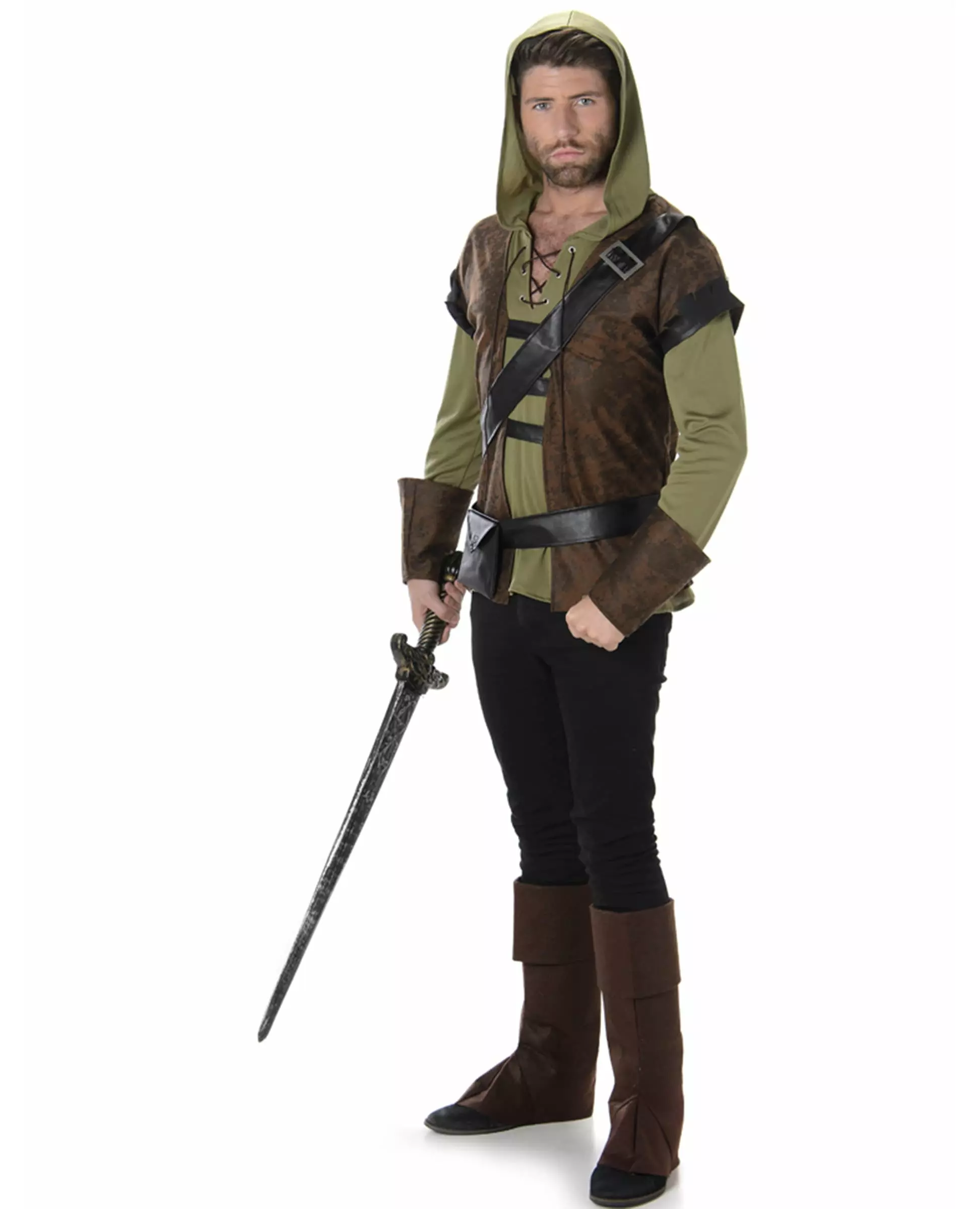 Bli en ekte skogsmann. Dette skogstyvkostymet for menn består av en langermet topp, en t-skjorte, et belte og støveltrekk. Den langermede toppen er khakigrønn. Den er dekorert med brune mansjetter i kunstskinn. Denne toppen med hette har brun snøring foran. Den brune t-skjorten i kunstskinn glir over den grønne toppen. Den er åpen foran og er dekorert med en svart stropp i kunstskinn som går fra skulderen til hoften. Denne toppen glir enkelt på med borrelås. Støveltrekkene er i svart kunstskinn. De er elastiske øverst og holdes under føttene med strikker. Det svarte beltet i kunstskinn lukkes med borrelås. En liten lomme er sydd på. Dette kostymet vil være perfekt for å bringe rettferdighet! Inkludert tilbehør: Topp, t-skjorte, belte, 2 støveltrekk Materiale: 100 % polyester Vedlikehold: Håndvask Målinformasjon: For størrelse M er den grønne toppen omtrent 67 cm lang (uten hette)