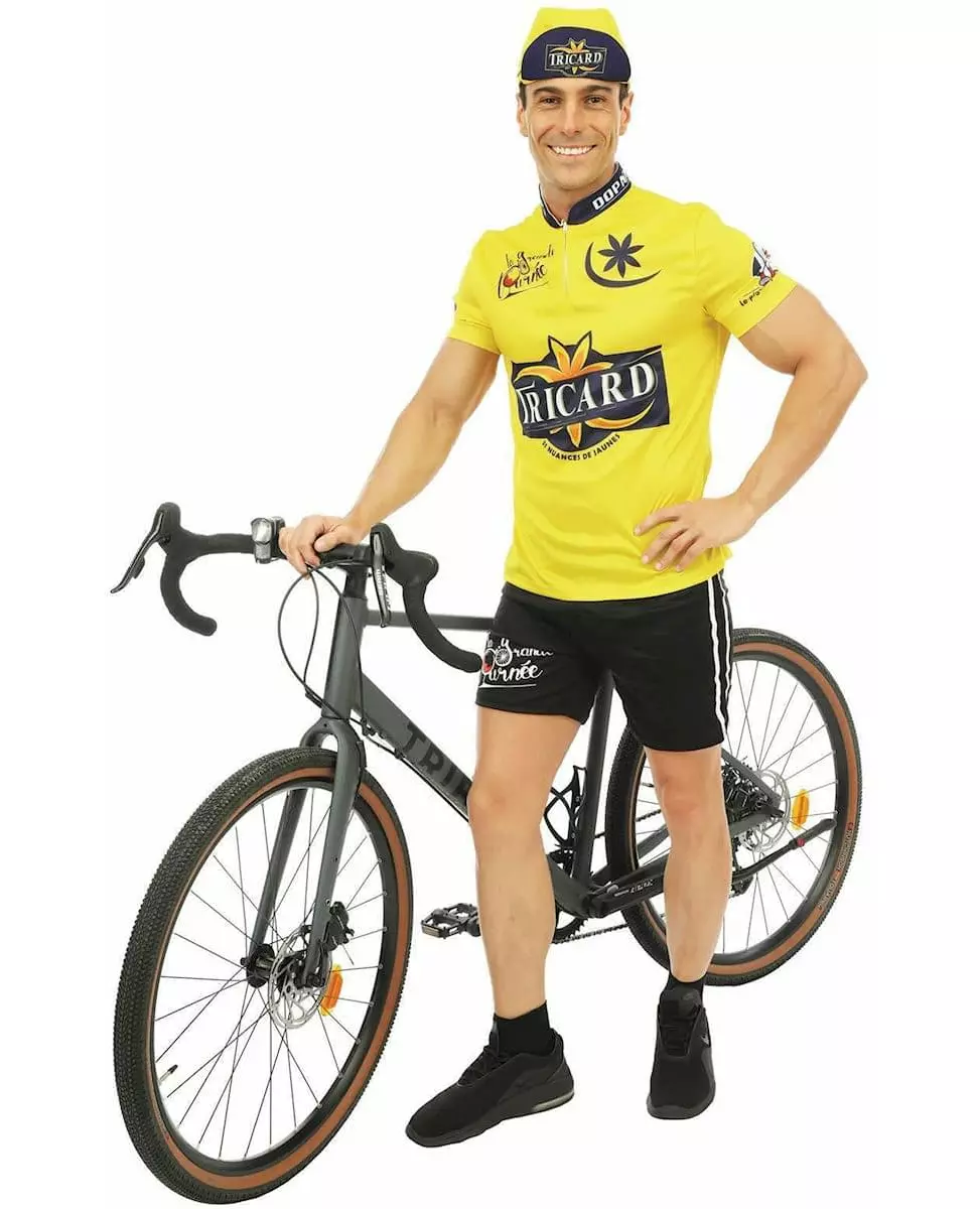 Den gule trøyen ... pastaga-versjonen! Dette sykkelkostymet for menn består av en knallgul trøye, svarte shorts og en matchende caps. Med sine humoristiske mønstre og Tricard-logoen som en nikk til en kjent drink, er toppen en vittig vri på feltets berømte gule trøye. Et utseende som fokuserer på hån og godt humør. De svarte shortsene gir et snev av edruelighet, og capsen fullfører dette uvanlige antrekket, perfekt for å få gjestene til å smile. Et originalt valg til kostymefester, utdrikningslag eller andre festlige arrangementer med sykkel- eller aperitifftema! Materiale: 2527. Inkludert tilbehør: 1 T-skjorte 1 par shorts 1 caps