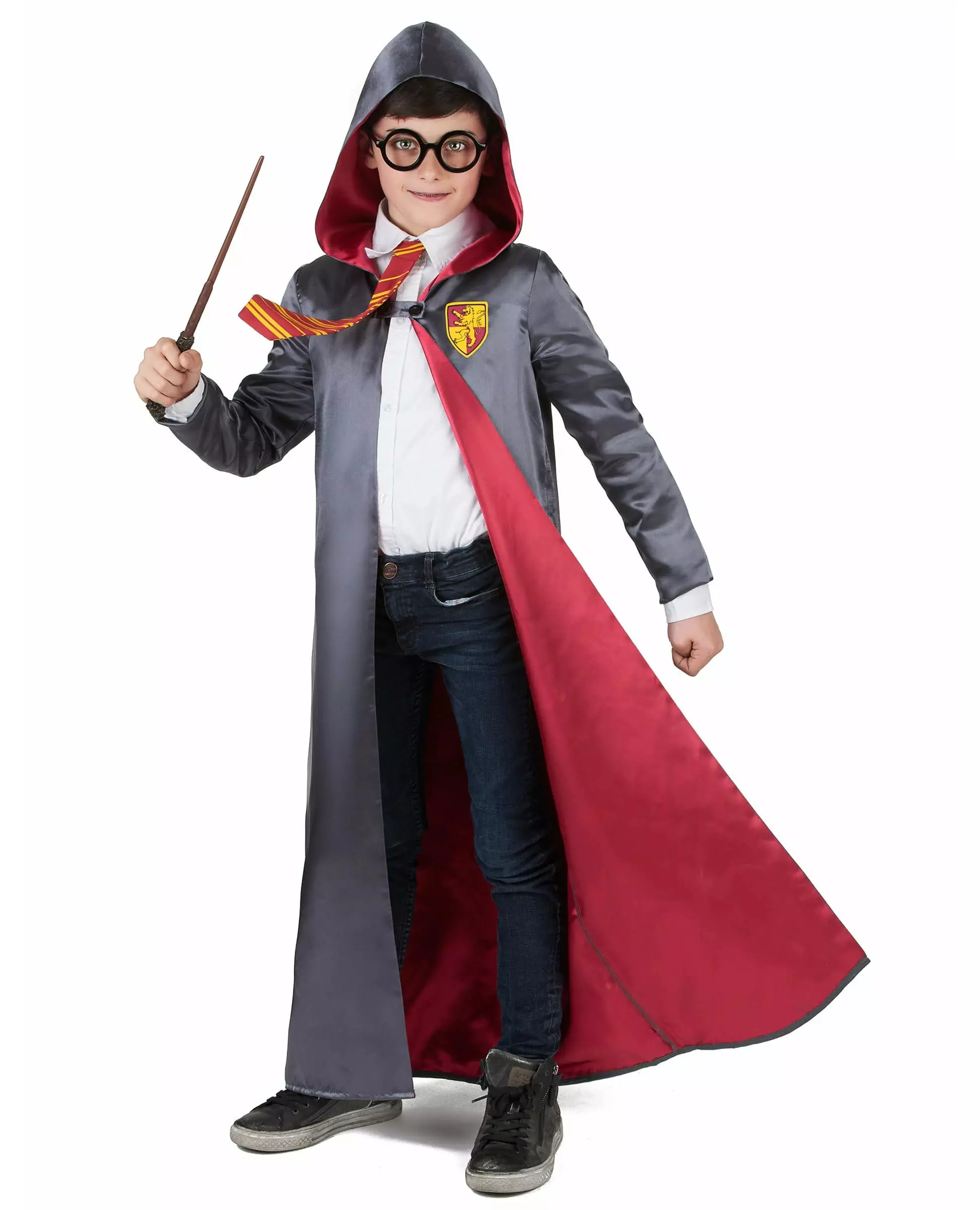 Expelliarmus! Dette trollmannslærlingkostymet for gutter inkluderer en kappe, et slips og et par briller. Kappen, grå på høyre side og burgunderrød på baksiden, er lang og laget av satengstoff. Antrekket lukkes øverst med en plastknapp og har et gult og rødt løvemønstret våpenskjold på brystet. En stor hette pryder trollmannskappen. Slipset er diagonalt stripete i rødt og gult. Det kan bæres rundt skjortekragen takket være den tynne hvite strikken. Til slutt er de svarte plastbrillene runde. De fullfører settet perfekt! Bli kveldens magi-elskende helt med dette kvalitetskostymet! Expecto Patronum!!. Inkludert tilbehør: Kjole Slips Briller Materiale: 100 % polyester Vedlikehold: Håndvask