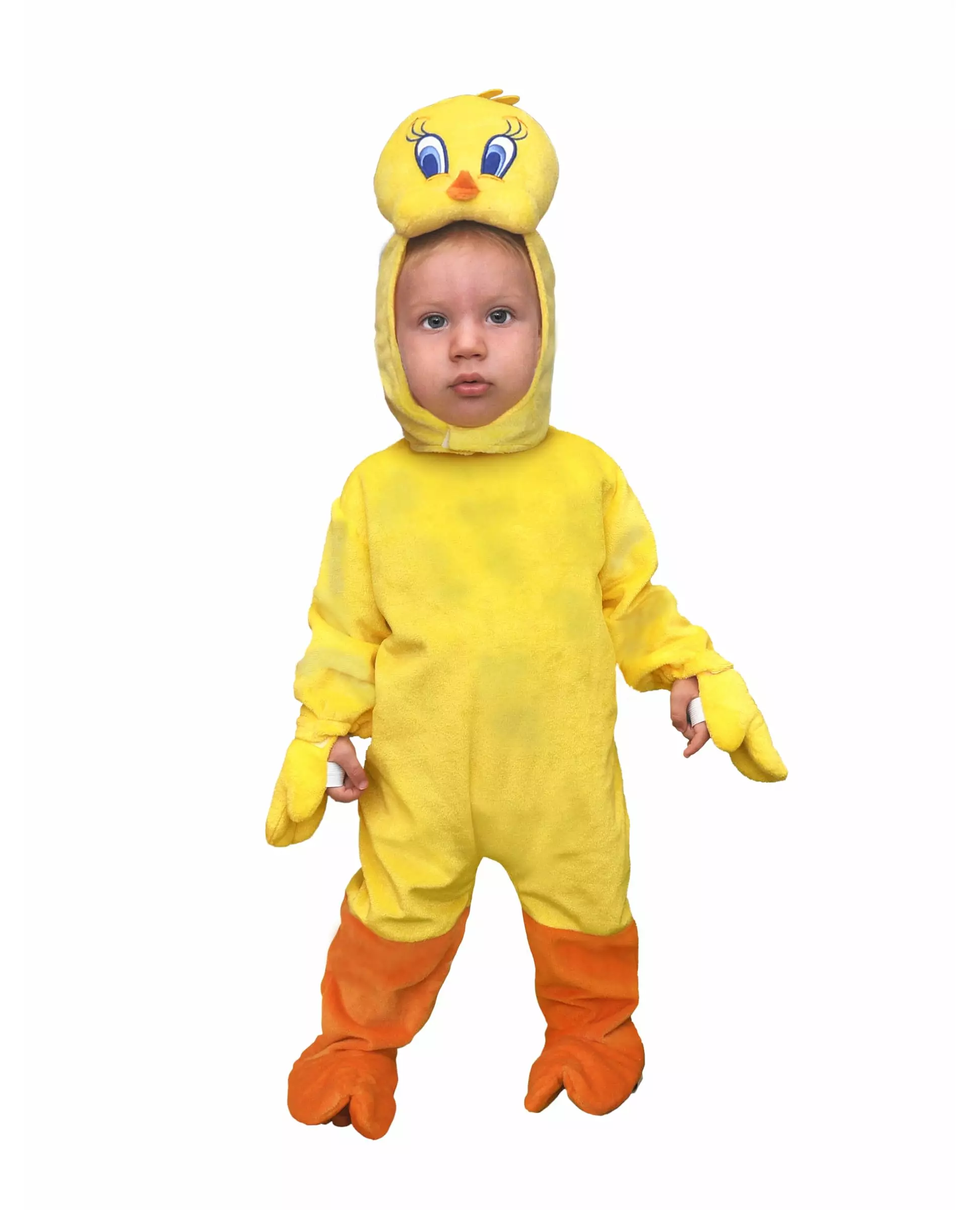 Jeg trodde jeg så en Sylvester! Dette Tweety Bird og Sylvester-kostymet for babyer er offisielt lisensiert av Warner Bros. Det består av en jumpsuit med glidelås og et hodeplagg. Jumpsuiten er gul med en plysjeffekt, så den vil være helt komfortabel for barnet ditt når den har på seg den. Den har lange ermer med fugleklør på håndleddene. Nederdelen av jumpsuiten tilsvarer falske fuglebein, oransje i fargen. Akkurat som hendene kan barnet ditt enkelt holde endene med en hvit strikk. Til slutt kjennetegnes hodeplagget av en pen hette som representerer hodet til Tweety, med sine store blå øyne og sitt lille oransje nebb. Den lar ansiktet være fritt og lukkes under haken med borrelås. Dette Tweety-kostymet vil gjøre babyen din til det søteste av alle barn på karneval eller til en bursdag! Tilbehør inkludert: Jumpsuit Hodeplagg Materiale: 100 % polyester Stell: Håndvask