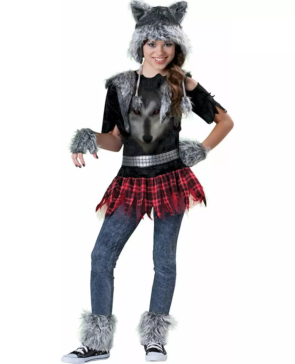 Litt elegant til Halloween-festen din! Dette ulvekostymet for jenter består av en topp, en tyllskjørt, en hatt, en vest, et par votter og leggvarmere (bukser og sko ikke inkludert). Toppen med fløyelseffekt er svart med et ulvehode foran. Ermene er kuttet i spisser, og den ene skulderen er bar for å gi kostymet en slitt effekt. For ekstra komfort er toppen elastikk bak i midjen. Toppen er komplett med en grå minivest med fløyelseffekt. Lange grå hår er på forsiden av vesten. Tutuen er rød med svarte ruter. Imiterte sølvnagler er flocket i midjen for å gi illusjonen av å ha på seg et belte. Denne tutuen er elastikk i midjen. Hatten er grå med syntetisk hår. Spisse ører er avbildet på toppen av hodet. Votter og mini-leggvarmere vil sette prikken over i-en på dette ulvekostymet. Denne forkledningen vil være perfekt for å gi deg et elegant og skummelt utseende til Halloween-festen din.