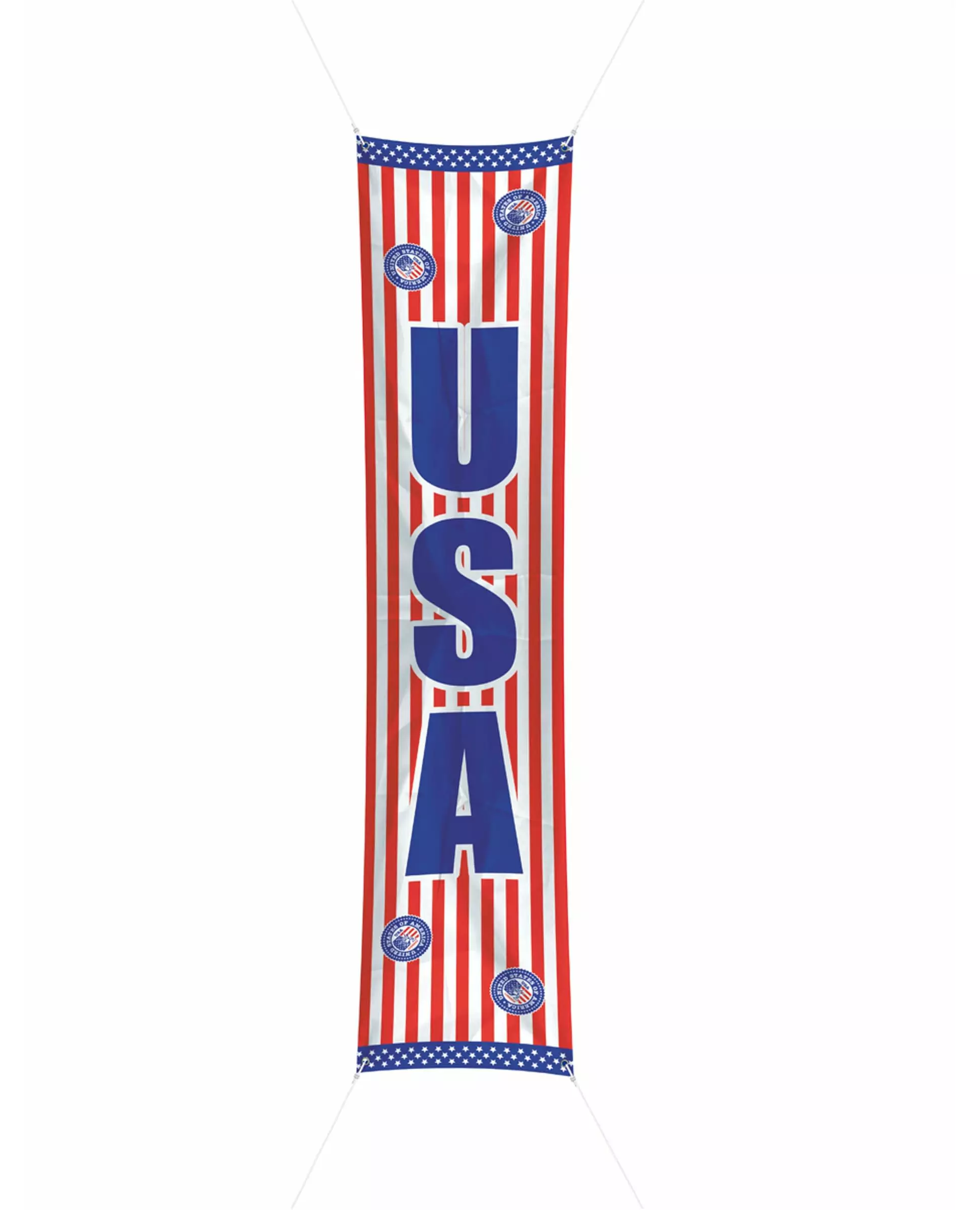 Få med deg USAs farger med denne dekorasjonen. Dette dørbanneret måler omtrent 300 x 60 cm. Det er i fargene til det amerikanske flagget: hvite og røde striper, blå bakgrunn og hvite stjerner. I midten finner du ordet «USA» skrevet med store bokstaver. Dette banneret vil være perfekt for å fullføre dekorasjonen din med temaet Amerika. Inkludert tilbehør: Banner