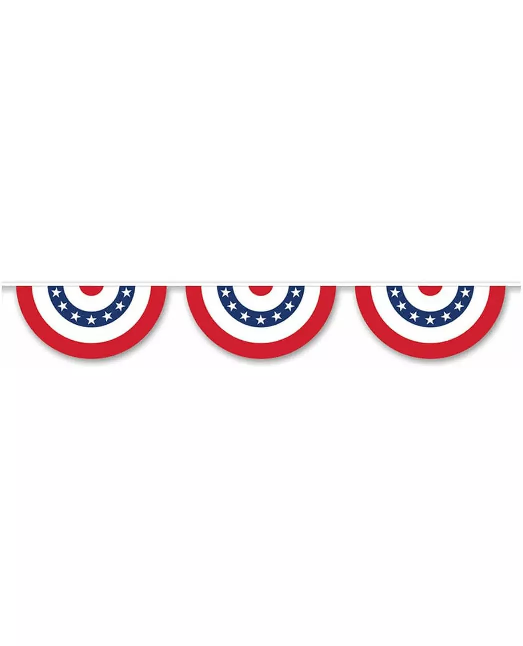 En girlander i fargene til det amerikanske flagget! Denne amerikanske girlanderen er laget av plast. Den måler omtrent 3,66 meter i lengde og er trykt med amerikanske motiver på den ene siden. Den består av flere halvsirkelformede vimpler som måler 56 cm i diameter. De er røde, hvite og blå, og små hvite stjerner dekorerer midten. Denne girlanderen i fargene til det amerikanske flagget vil være perfekt for å forbedre romdekorasjonen din til en kveld med USA-tema. Inkludert tilbehør: Girlander Materiale: Plast