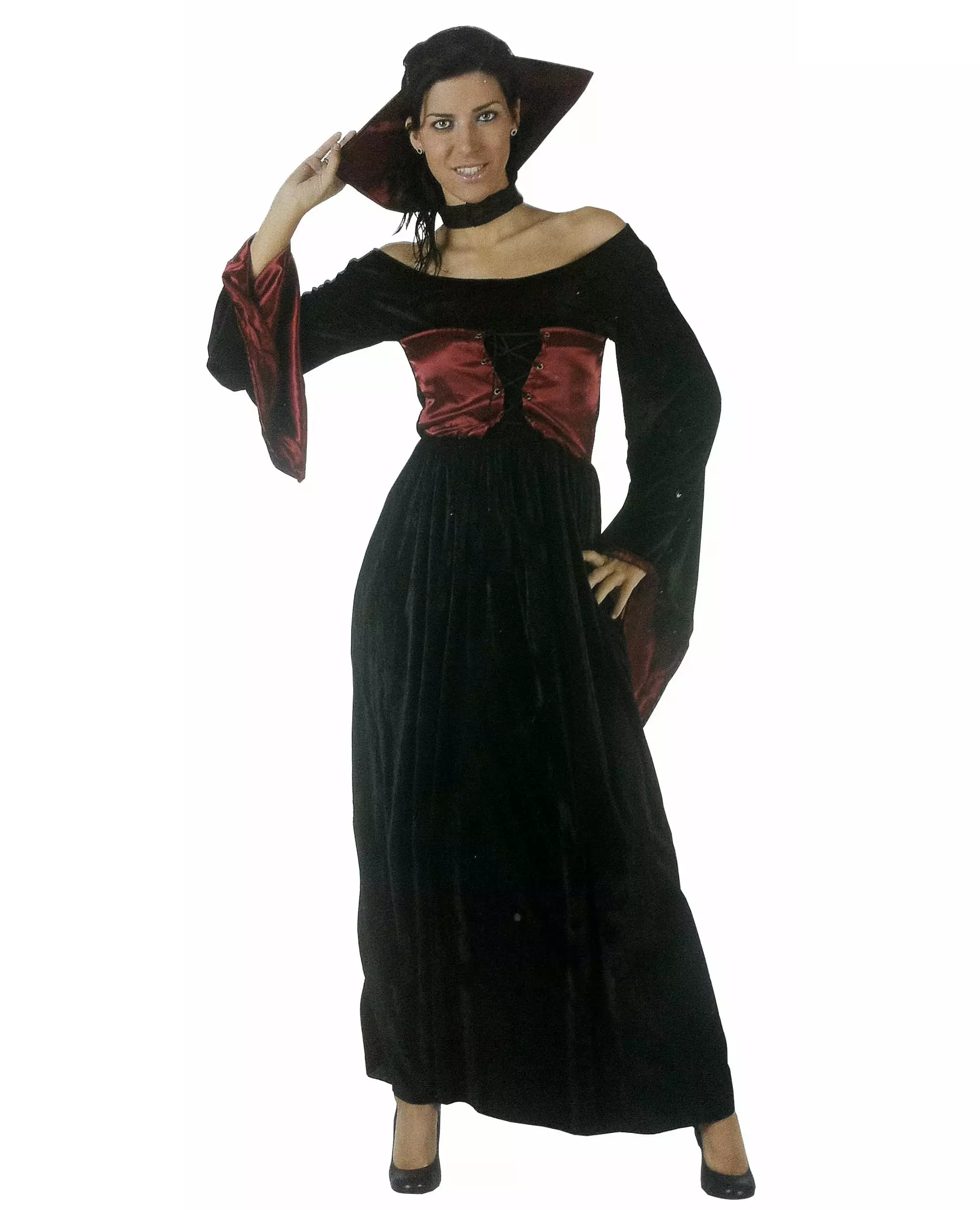 Et komfortabelt og elegant kostyme! Dette vampyrkostymet for kvinner inkluderer en kjole og en krage (sko ikke inkludert). Den langermede kjolen er svart med fløyelsutseende og et burgunderrødt satengkorsett. Kragen festes med borrelås og har også et fløyelsutseende på utsiden og et satengutseende på innsiden. Du vil være den vakreste vampyren til kostymefesten eller til Halloween. Inkludert tilbehør: Kragekjole Materiale: 100 % polyester Pleie: Håndvask