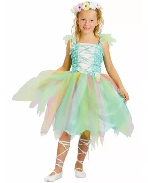 Blomsterkrone inkludert! Dette sjøgrønne fe-kostymet er for jenter og inkluderer en kjole og en blomsterkrone. Kjolen har en bystedel laget av mintgrønt og hvitt fleecestoff med en liten tusenfryd på siden. Stroppene er sydd med grønn og blå tyll. Nederdelen av kjolen er laget av mintgrønt stoff under og dekket med strimler av grønn, blå og rosa tyll. Kjolen glir på som en t-skjorte. Blomsterkronen er laget av plast dekorert med vakre stoffblomster. Den vil pryde ethvert hode på en veldig magisk måte. Dette veldig fine settet vil være perfekt for datteren din for å fordype seg i feenes fantastiske verden til et karneval eller en danseforestilling. Tilbehør inkludert: Kjolekrone Materiale: 100 % polyester Stell: Håndvask