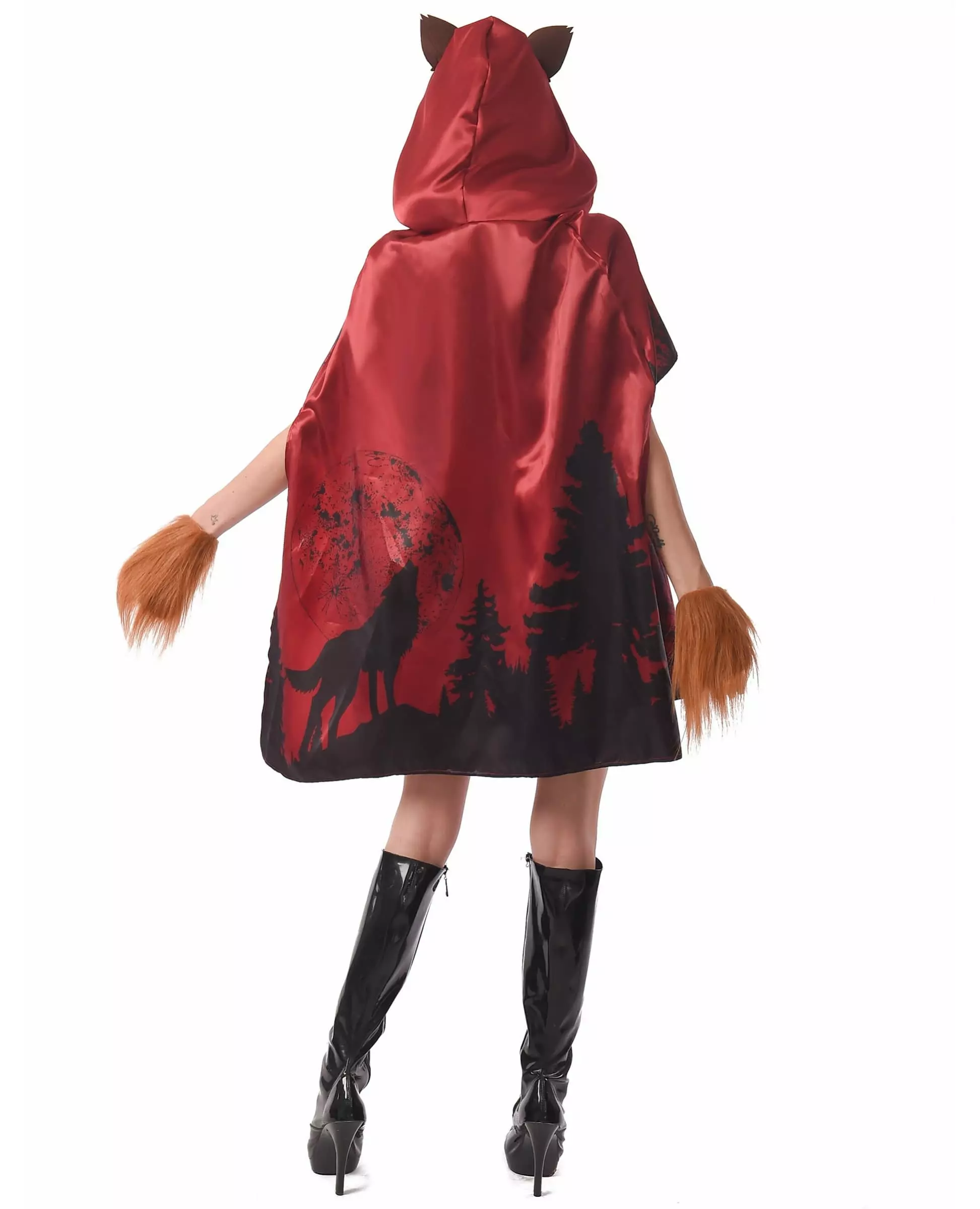 En varulvhette til Halloween-festen din! Dette varulvhette-kostymet for kvinner består av en kjole, et par hansker og en kappe med hette (sko ikke inkludert). Kjolen er rød og svart. Undersiden er rød og er dekorert med svarte rutete mønstre. Overdelen er svart og har ripemerker foran. Den har også en rød krage. Kappen er rød og er dekorert med forskjellige svarte design. En hylende varulv er tegnet på baksiden av kappen. Den har også en hette med små varulvører og er dekorert med en vakker rød og svart sløyfe. Hanskene ligner varulvpoter og er brune med en plysjeffekt. Legemliggjør de to karakterene fra den berømte historien på en Halloween-fest! Inkludert tilbehør - Kjole - Hansker - Kappe med hette Målinformasjon For størrelse XS: kappen er ca. 59 cm lang og ca. 63 cm bred. For størrelse S: kappen er ca. 61 cm lang og ca. 75 cm bred. For størrelse M: kappen er ca. 67 cm lang og ca. 75 cm bred. For størrelse L: kappen er ca. 70 cm lang og ca. 89 cm bred.