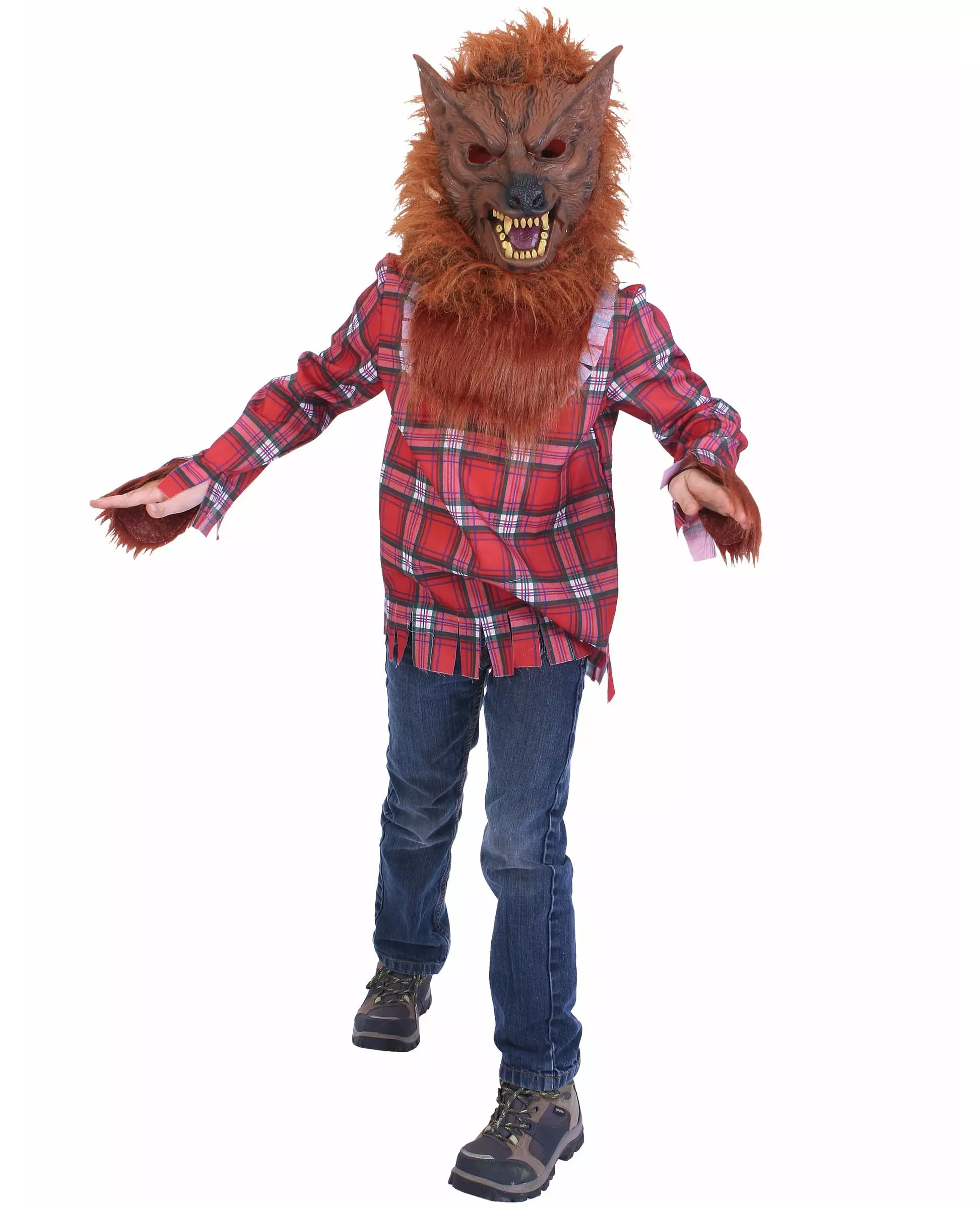 Vent på fullmånen for å skremme vennene dine med dette varulvkostymet for gutter! Dette varulvkostymet for gutter inkluderer maske og skjorte (sko og bukser er ikke inkludert). Den langermede skjorten er rød med ruter. Endene på ermene og bunnen av skjorten er revet, som for å imitere et klesplagg som er skadet av de mange forvandlingene. Masken forestiller en brun ulv med rød pels, den åpne munnen avslører skarpe tenner ... Ta på deg dette varulvkostymet for gutter på din neste Halloween-fest eller til en fest med temaet monstre og skapninger ... Produktnummer 304141 Tilgjengelighet S 4-6 år (110-120 cm) 304141, M 7-9 år (120-130 cm) 304139, L 10-12 år (130-140 cm) 304137, Stell og vask Håndvask Tilbehør inkludert - Skjorte - Maske