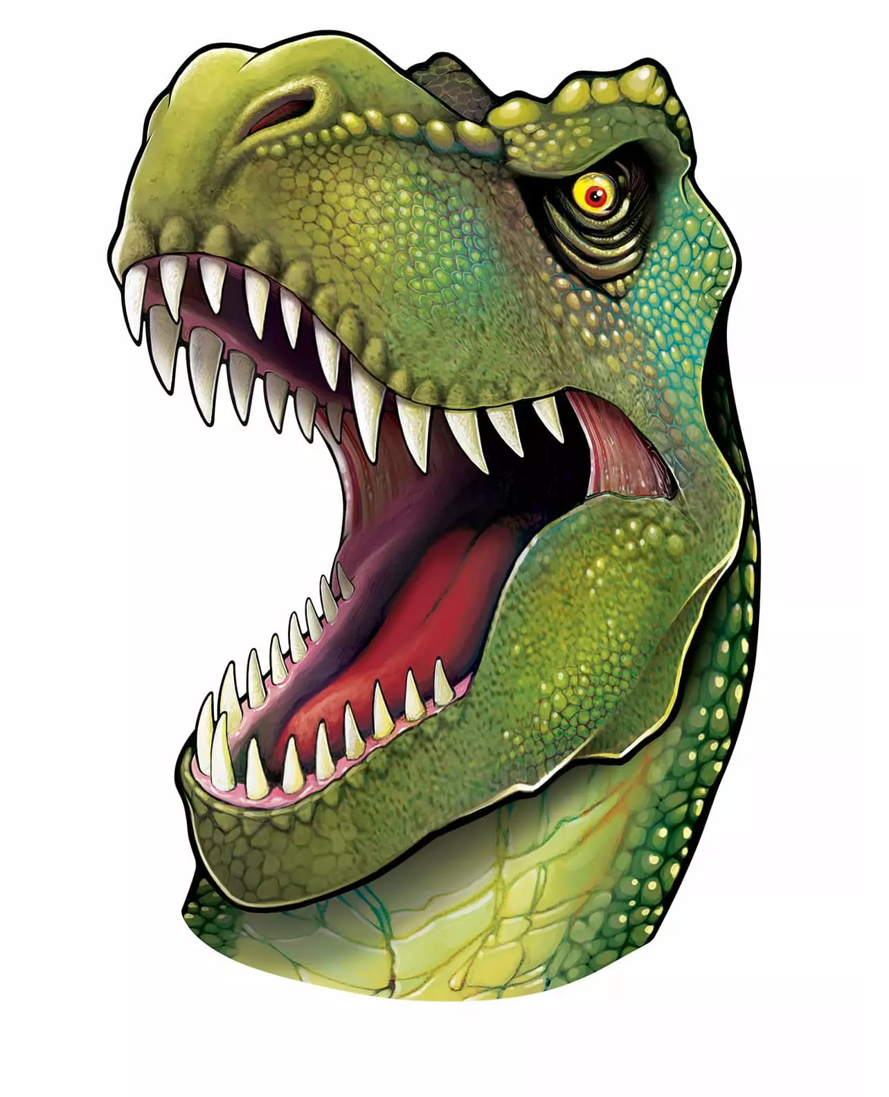 Se opp for T-rexen! Denne veggdekorasjonen med dinosaurhode måler omtrent 86 cm. Den forestiller en tyrannosaurus med vidåpen munn og et skremmende utseende. Den har lange, skarpe tenner og ru grønn hud. Denne dinosaurutskjæringen vil være ideell å gi til barnet ditt som er en dinosaurfan til bursdagen sin! Inkludert tilbehør: 1 veggdekorasjon Materiale: Papp