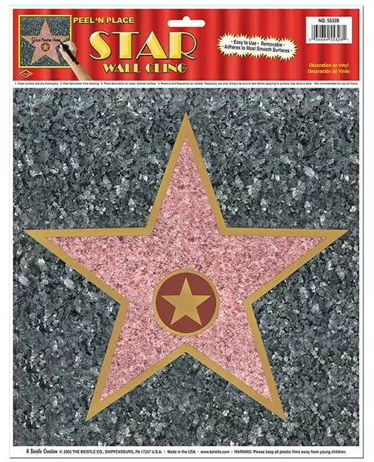 Veggdekorasjon som forestiller en stjerne som på Hollywood Walk of Fame. Det er reservert plass nederst til å skrive et fornavn som filmstjernen. Stjernen er maksimalt ca. 27 cm lang. Perfekt for en film- eller Hollywood-temakveld. Inkludert tilbehør: Veggdekorasjon