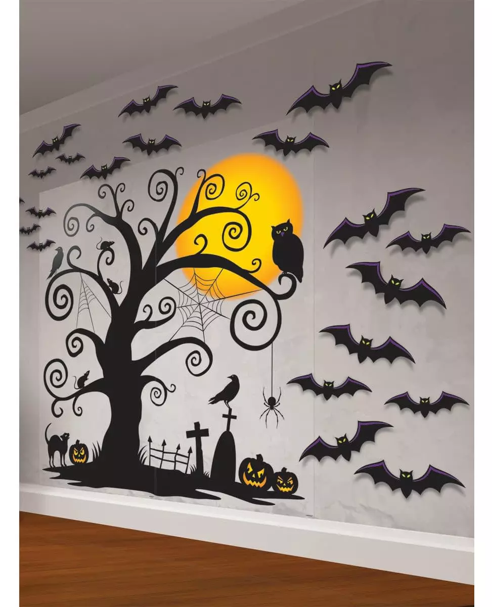kveld er det Halloween! Dette veggdekorasjonssettet består av 32 deler! De første 30 elementene er flaggermus i forskjellige størrelser og svarte i fargen. Disse er laget av kartong, trykt på begge sider. Av disse 30 flaggermusene måler 15 omtrent 17,5 cm brede, 9 er omtrent 30 cm brede og 6 måler omtrent 43 cm brede. De andre 2 elementene er de største, og måler omtrent 1,65 meter ganger 82,5 cm. De er laget av tynn, gjennomsiktig plast, hvor det er trykt et kirkegårdslandskap der disse elementene har gresskar, et tre med krøllete grener og nattdyr. I bakgrunnen fremkaller en gul stjerne en fullmåne. Alle disse elementene kan enkelt henges på veggene dine med tape eller lim. Har du en vanlig vegg hjemme? Disse dekorasjonene vil virkelig passe til Halloween-temafesten din!. Inkludert tilbehør: 32 dekorative deler.