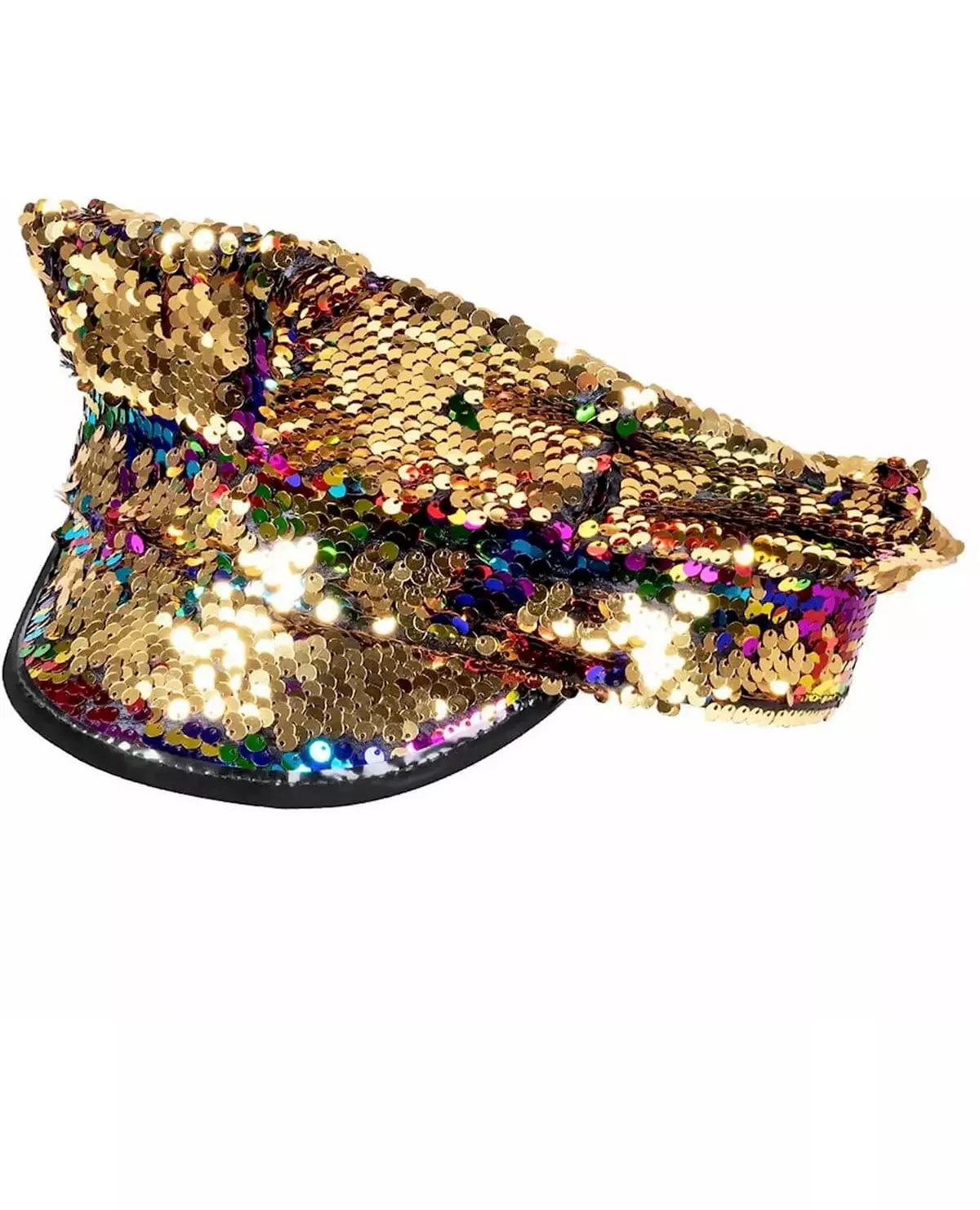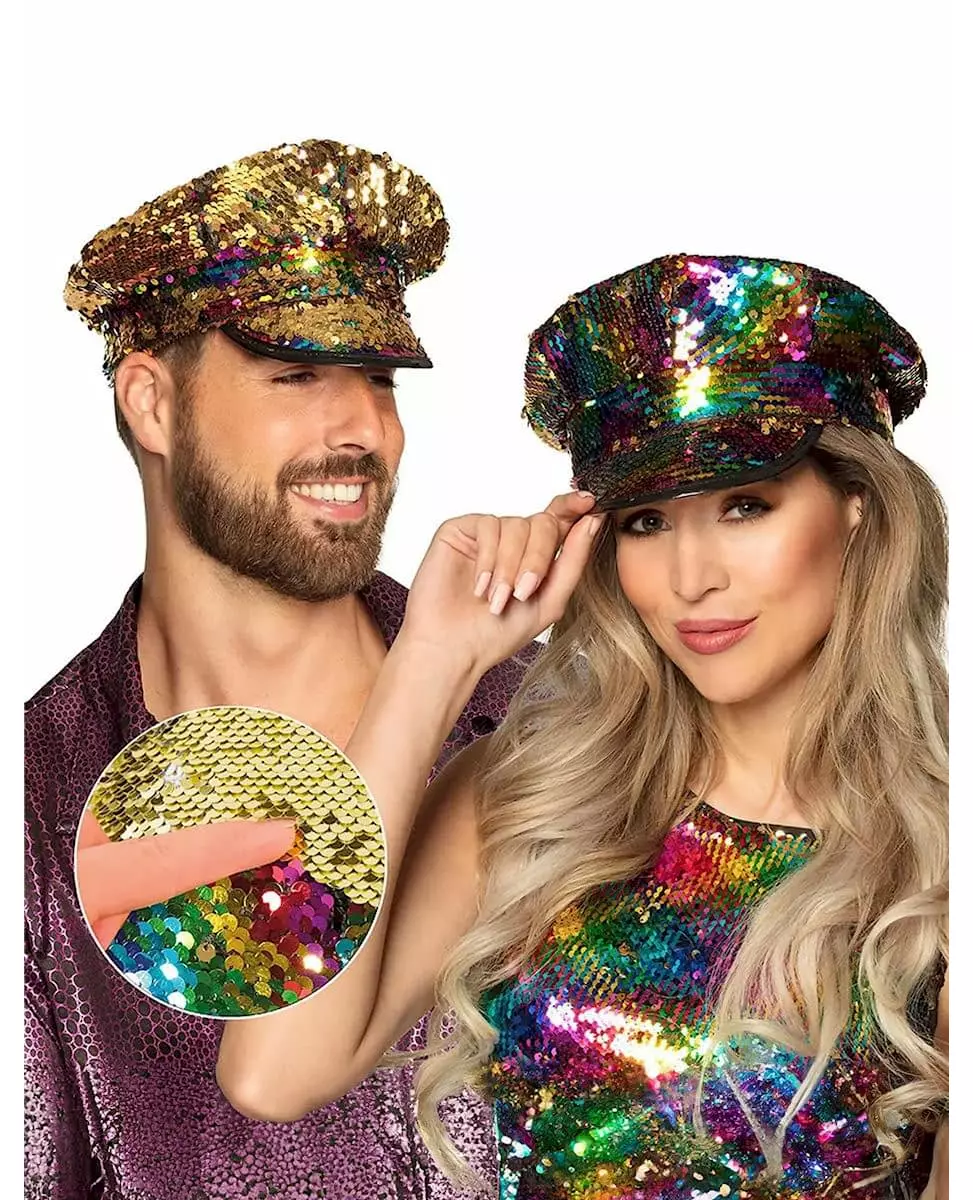 Skinn klart! Denne vendbare capsen med regnbue- og gullpaljetter er for voksne. Den er i regnbue- og gullfarget med speilfasetter i alle farger, slik at alle rundt deg kan se deg på avstand! Du vil ikke gå ubemerket hen med denne trendy og morsomme capsen på et diskotekfest eller en temafest! Inkludert tilbehør: 1 caps Materiale: 90 % polyester, 8 % polypropylen, 2 % polyuretan Vedlikehold: Ikke vaskbar
