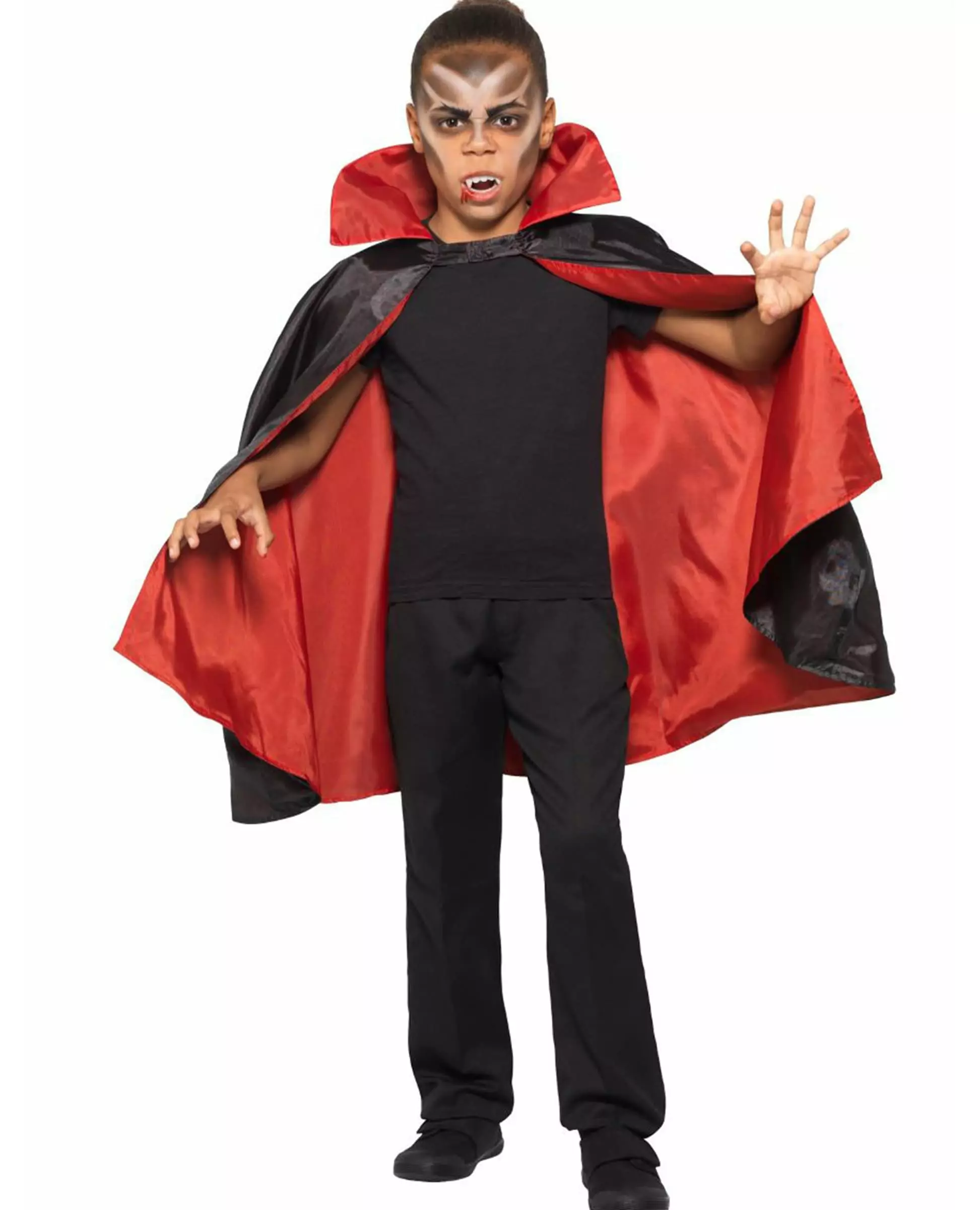 En vendbar kappe Denne vendbare vampyrkappen er for barn. Denne lange kappen er svart på utsiden og rød på innsiden. Den er laget av satengstoff og er vendbar. En rett krage er sydd på kappen, og en borrelås gjør at den kan festes rundt halsen. Denne vendbare vampyrkappen vil være perfekt for en Halloween-fest eller en fest med magi og skrekktema. Inkludert tilbehør: Kappe Materiale: 100 % polyester Vedlikehold: Håndvask