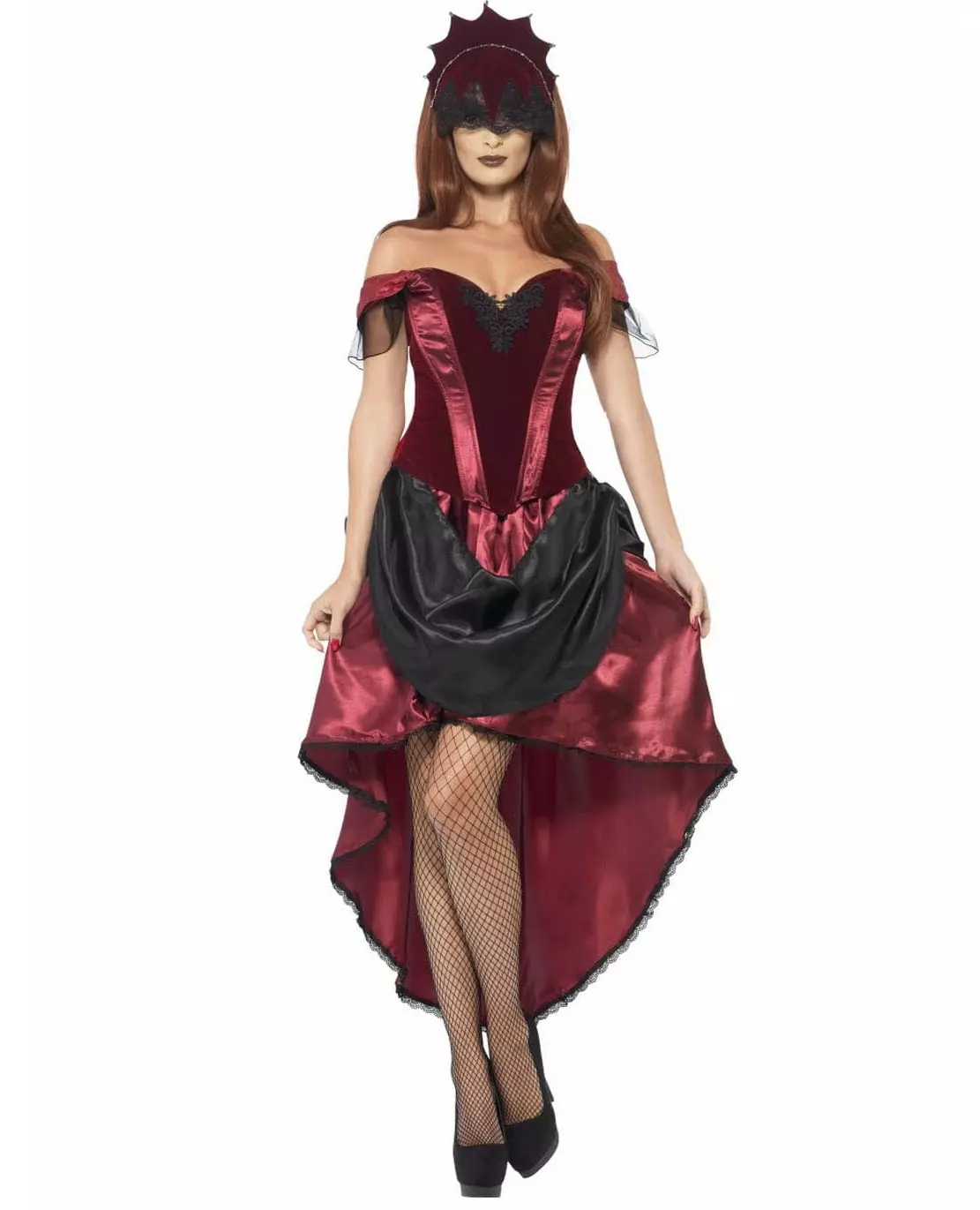 Avslør sjarmen din i dette venetianske forførerske-antrekket. Dette venetianske forførerske-kostymet for kvinner består av et korsett, et skjørt og et hodeplagg (strømpebukser og sko er ikke inkludert). Det svært elegante korsettet er burgunderrødt med satengbånd. Stive bøyler foran holder korsettet på plass. Bak er korsettet laget av rødt elastisk stoff. Skjørtet er svart og burgunderrødt, i satengstoff. Skjørtet er lengre bak enn foran. For ekstra komfort er det elastikk i midjen. Hodeplagget består av et pannebånd med stofftupper og svart blonder festet på. Dette demoniske forførerske-kostymet vil være perfekt for å delta på en kveld med karnevalstema i Venezia. Inkludert tilbehør: Korsett, skjørt, hodeplagg, Materiale: 100 % polyester,