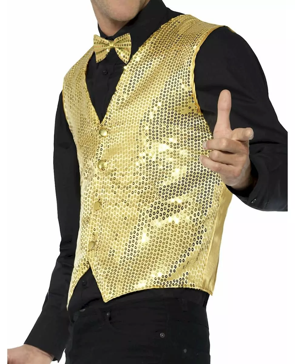 Gullpaljetter! Denne gullfargede paljettvesten er for menn (kun vesten er inkludert). Den har paljetter foran, og stoffet er i gullsateng på baksiden. Vesten festes med fire knapper foran. Den har også to knytebånd med spenne på baksiden, slik at den kan knytes igjen bak. Vesten er perfekt for å fullføre et paljettkostyme til et diskotek eller en Charleston-kveld. Inkludert tilbehør: Vest Materiale: 100 % polyester Vedlikehold: Håndvask
