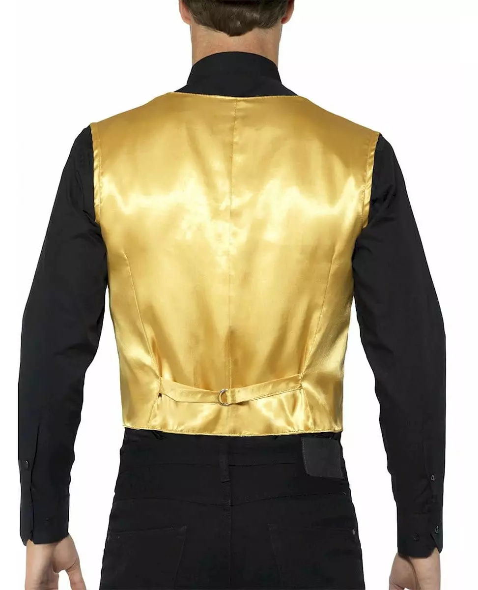 Gullpaljetter! Denne gullfargede paljettvesten er for menn (kun vesten er inkludert). Den har paljetter foran, og stoffet er i gullsateng på baksiden. Vesten festes med fire knapper foran. Den har også to knytebånd med spenne på baksiden, slik at den kan knytes igjen bak. Vesten er perfekt for å fullføre et paljettkostyme til et diskotek eller en Charleston-kveld. Inkludert tilbehør: Vest Materiale: 100 % polyester Vedlikehold: Håndvask