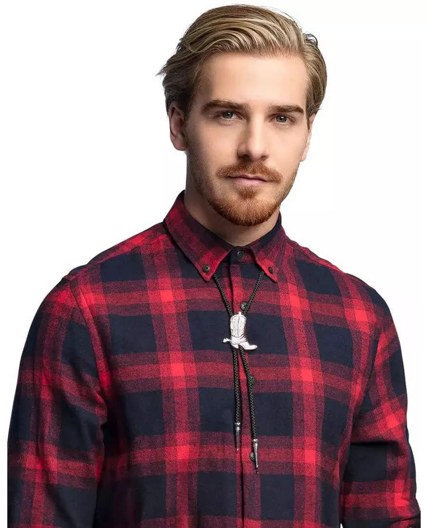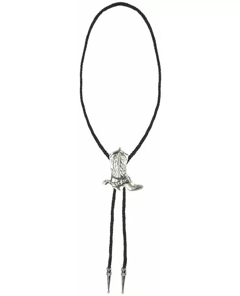Offisielt Arizona-slips, en tradisjon i Ville Vesten. Dette kostymetilbehøret er et halskjede for voksne. Det består av et svart tau som ender i to sølvfargede tupper. En feste formet som en cowboystøvel lar deg knyte slipset mer eller mindre stramt. Dette bolo-slipset, et populært tilbehør på 50-tallet, vil sette prikken over i-en på cowboy- eller cowgirl-kostymet ditt på en western-tema-kostymefest. Inkludert tilbehør: Halskjede