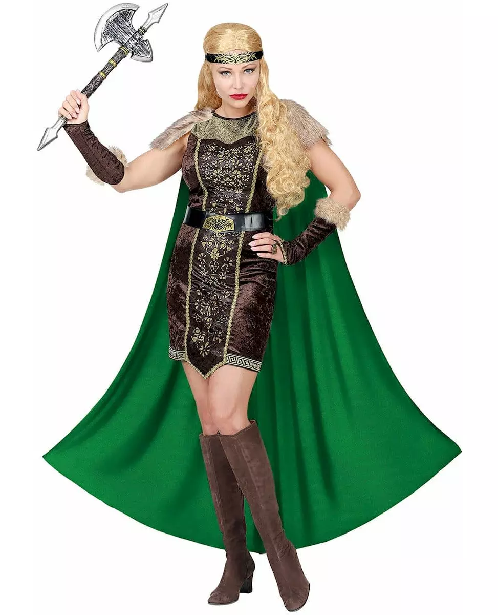 dette kostymet blir du forvandlet til en ekte viking. Dette vikingkostymet for kvinner består av en kjole med kappe, belte, mansjetter og et pannebånd (øks, smykker og sko er ikke inkludert). Kjolen er brun med fløyelseffekt og mønstre med gullnoter i midten. Fuskepels er på skuldrene. Bak finner du en lang grønn kappe. Beltet er i svart imitert skinn. Det vil fremheve midjen din. Ermene er brune og matcher kjolen. De har en liten elastisk løkke som går over en finger. Til slutt fullfører et pannebånd dette fantastiske kostymet. Dette vikingkostymet vil være perfekt for å gjøre et plask på karnevalet. Inkludert tilbehør: Kjole med kappe Belte 2 mansjetter Pannebånd Materiale: 100 % polyester Vedlikehold: Håndvask