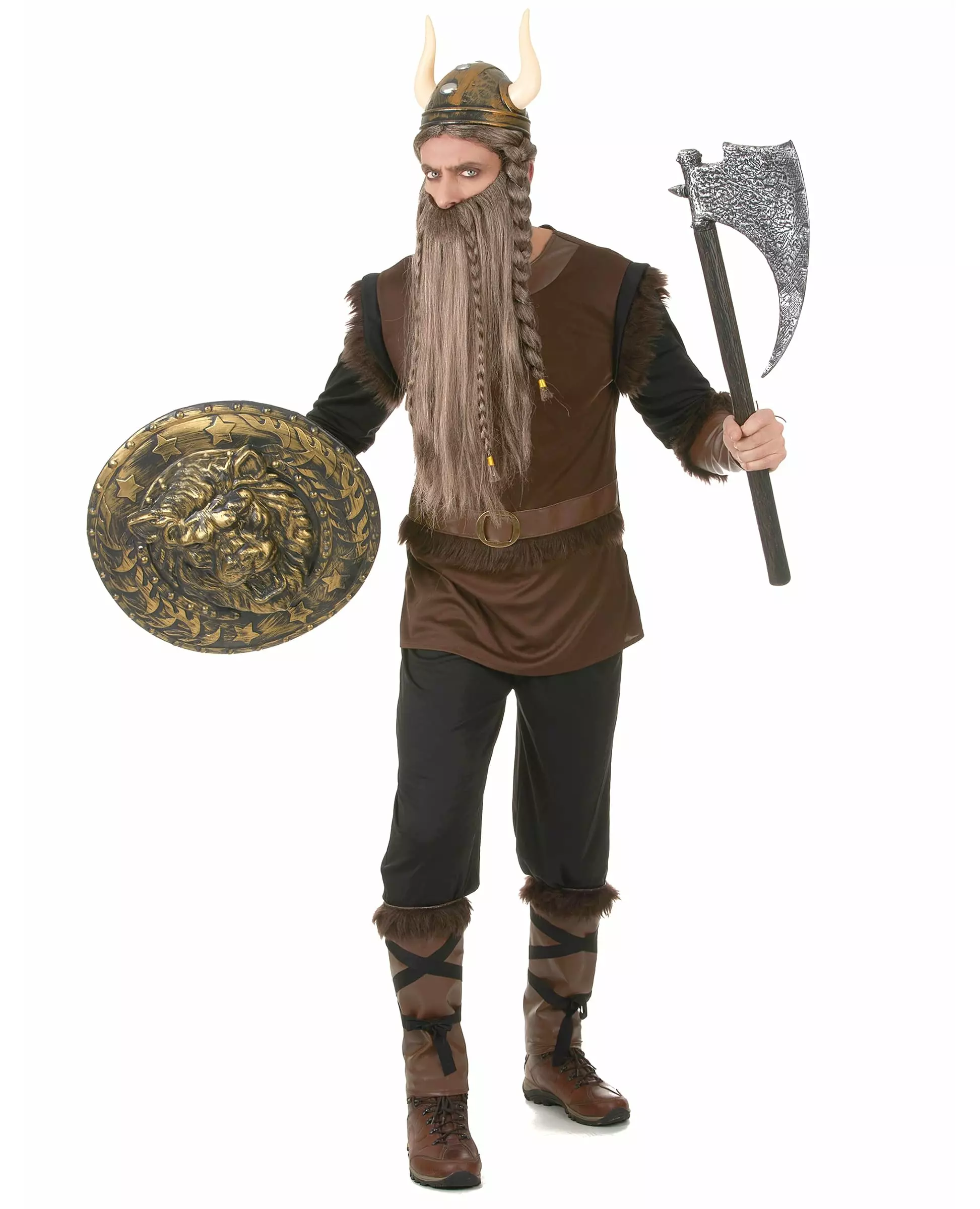 Frykt vikingens hevn! Dette fantastiske vikingkostymet for menn består av topp, bukser, hjelm, ermer og leggings (øks, skjegg, parykk og skjold er ikke inkludert). Den langermede toppen er brun og svart, og har brune fuskepelspaneler på skuldrene. I livet er et belte med læreffekt og fuskepelslinje sydd direkte til genseren. Buksene, med elastikk i midjen, er svarte. Leggingsene og ermene er laget av brunt skinn. De er kantet med syntetisk hår, noe som virkelig gir kostymet et vilt utseende. Til slutt er hjelmen laget av plast og har imponerende horn. Hodeomkretsen er omtrent 59 cm. Dette svært komplette kostymet vil være perfekt for å spille barbarer fra en annen tid under en temafest eller til og med på karneval! Inkludert tilbehør: Topp, bukser, hjelm, 2 leggvarmere, 2 ermer Materiale: 100 % polyester Vedlikehold: Håndvask