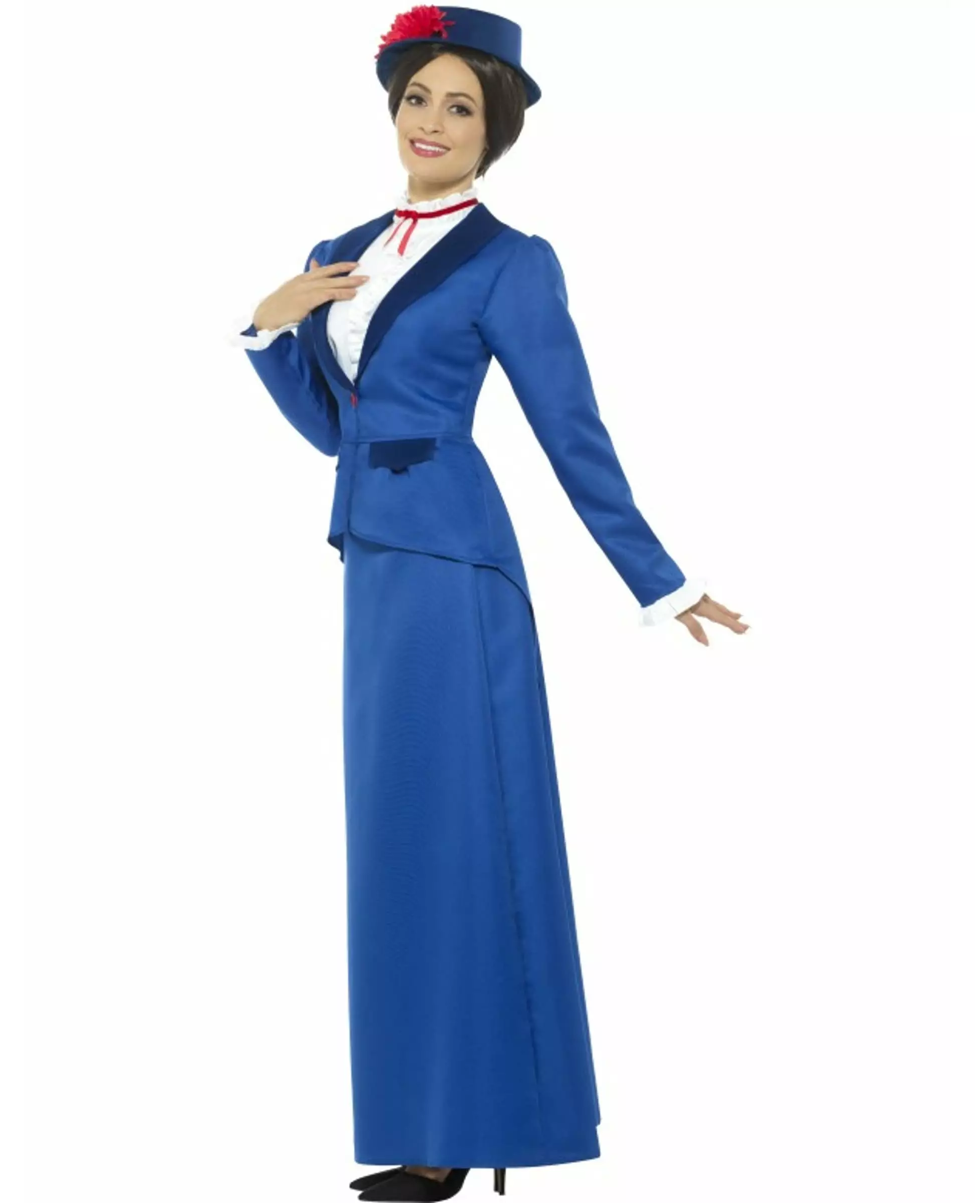 En virkelig elegant barnepike! Dette damekostymet består av en jakke med skjortekrage, et skjørt og en hatt. Jakken er blå. En pen hvit skjortekrage er sydd fast på jakken. Den har også en åpning bak. Skjørtet er langt og blått. Hatten er blå og dekorert med en pen rød blomst. Dette viktorianske barnepikekostymet vil være ideelt for en kostymefest med historisk tema! Inkludert tilbehør: Jakke med skjortekrage Skjørt Hatt Materiale: 100 % polyester Vedlikehold: Håndvask