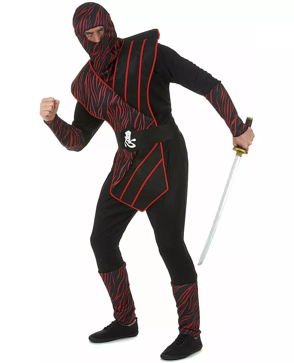 Stille som et udyr Dette ninjakostymet for menn inkluderer en topp, bukser, et belte, en brystbeskytter og en hette (sabel og sko er ikke inkludert). Toppen og buksene er laget av mykt, svart stoff sydd med rødstripete innlegg i endene. Den elastiske linningen på buksene sikrer optimal komfort når de brukes. Brystbeskytteren og beltet som skal knytes bak er laget av tykk filt. Rustningen vil bli tilpasset takket være beltet. Hetten har samme stripete trykk og vil dekke hele hodet bortsett fra øynene. Dette ninjasettet vil gjøre deg formidabel på karnevalsdagen, for eksempel, eller til en forestilling. Ingen vil kjenne deg igjen, det kan du være sikker på!. Inkludert tilbehør: Hette Topp Bukser Rustning Belte Materiale: 100 % polyester Stell: Håndvaskbar Målinformasjon: For en størrelse L, brystbeskytter på ca. 88 cm og bukser på ca. 110 cm
