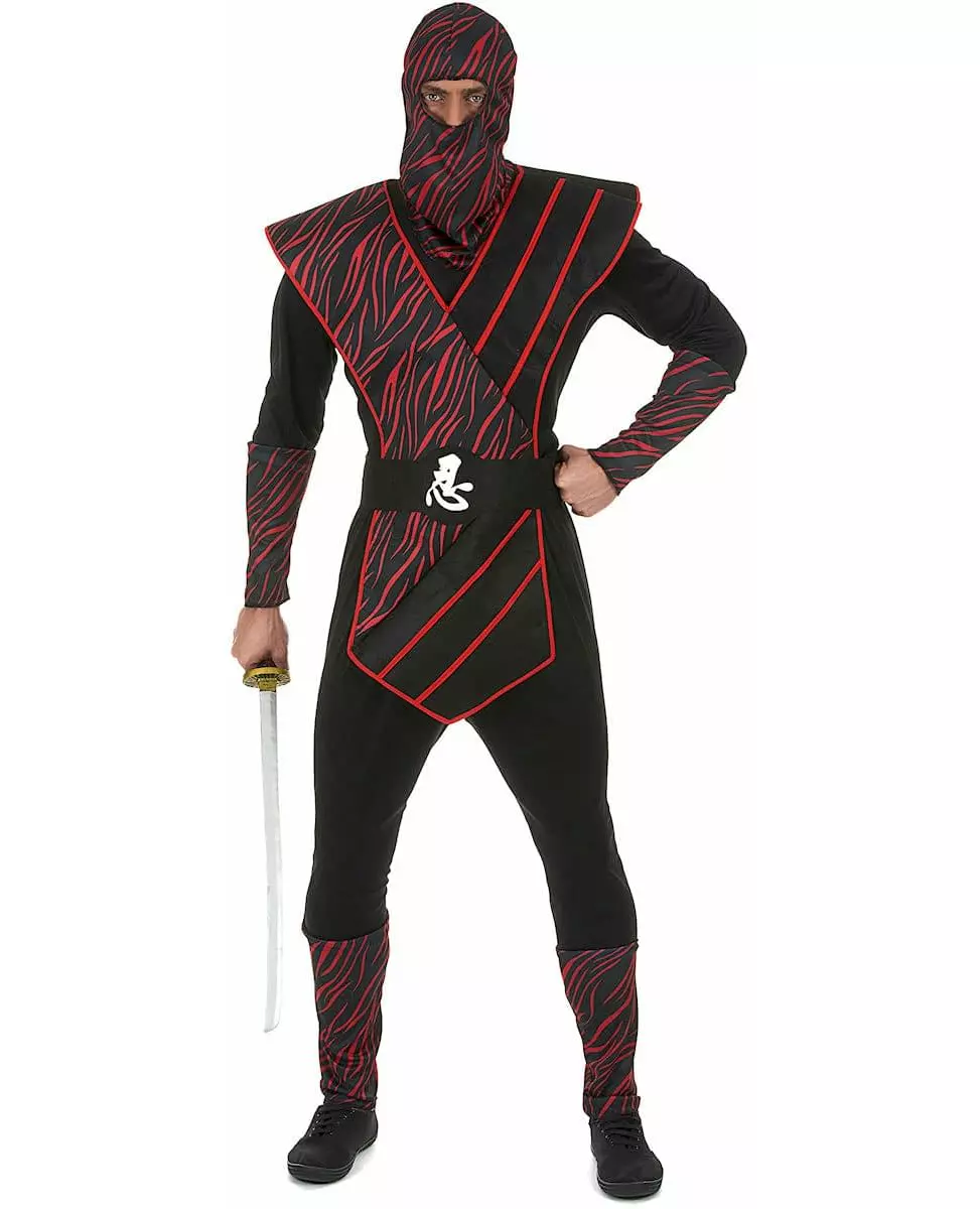 Stille som et udyr Dette ninjakostymet for menn inkluderer en topp, bukser, et belte, en brystbeskytter og en hette (sabel og sko er ikke inkludert). Toppen og buksene er laget av mykt, svart stoff sydd med rødstripete innlegg i endene. Den elastiske linningen på buksene sikrer optimal komfort når de brukes. Brystbeskytteren og beltet som skal knytes bak er laget av tykk filt. Rustningen vil bli tilpasset takket være beltet. Hetten har samme stripete trykk og vil dekke hele hodet bortsett fra øynene. Dette ninjasettet vil gjøre deg formidabel på karnevalsdagen, for eksempel, eller til en forestilling. Ingen vil kjenne deg igjen, det kan du være sikker på!. Inkludert tilbehør: Hette Topp Bukser Rustning Belte Materiale: 100 % polyester Stell: Håndvaskbar Målinformasjon: For en størrelse L, brystbeskytter på ca. 88 cm og bukser på ca. 110 cm