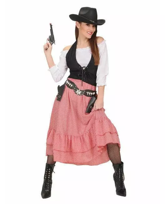 Bli en heltinne i erobringen av Vesten! Dette westernkostymet for kvinner inkluderer en topp og et skjørt (hatt, belte, strømpebukser, sko og revolver er ikke inkludert). Den hvite skjorten er bare-shoulder og har et svart snørekorsett. Skjørtet er langt med rysjer og trykt med røde og hvite ruter. Dette cowgirl-kostymet vil være ideelt å bruke til karneval eller på en westernkveld! Copyright Widmann SRL. Inkludert tilbehør: Skjorte med korsett Skjørt Materiale: 100 % polyester Vedlikehold: Håndvaskbar