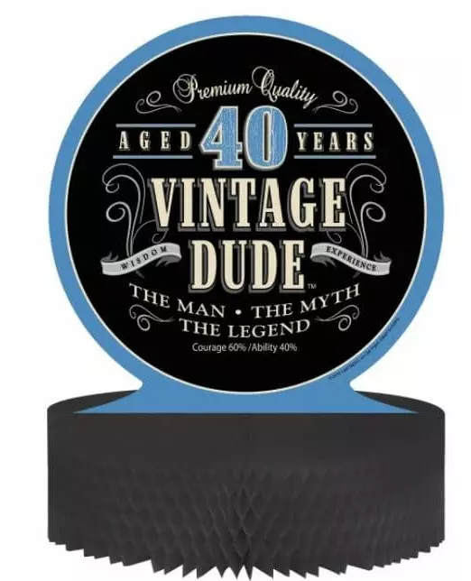 En fest i saloon-atmosfæren! Dette midtstykket måler 30 x 30 cm. Det er satt sammen av to deler. Bunnen er svart bikakepapir. På toppen er det et rundt pappklistremerke. Typografien minner oss om brennevinsflaskene i Amerika på 1880-tallet. Inskripsjonene er dedikert til det nye førtiåringen. Bakgrunnen er svart med en blå omriss. Fordyp gjestene i saloon-atmosfæren til en bursdagsfest med dette vintage midtstykket som kan kompletteres med andre produkter fra serien. Inkludert tilbehør: Midstykke Materiale: Papir