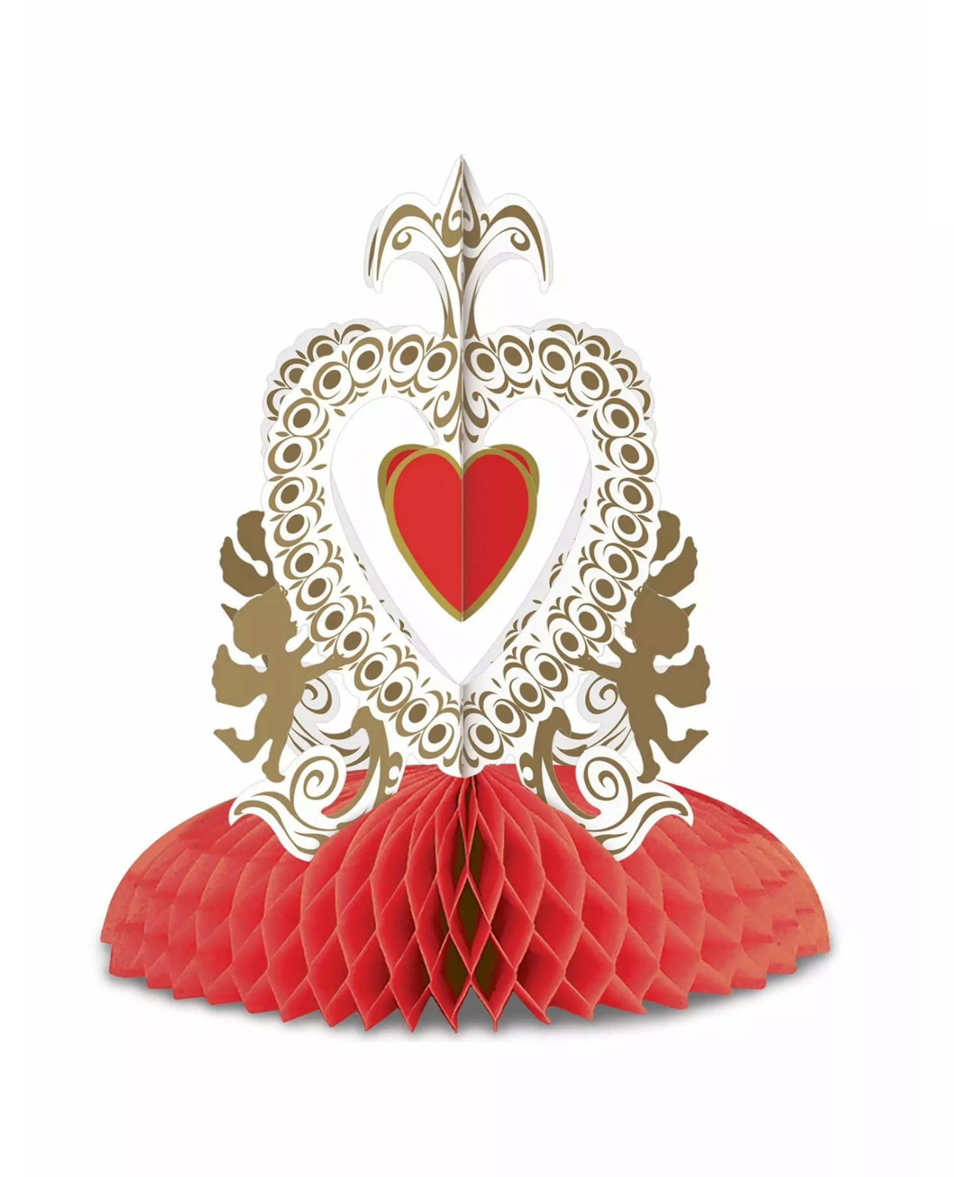 Vintage rødt midtpunkt til Valentinsdagen, 30 cm. Et romantisk midtpunkt til Valentinsdagen. Dette midtpunktet er laget av rødt bikakepapir og en hjerteformet pappdekorasjon med små engler.